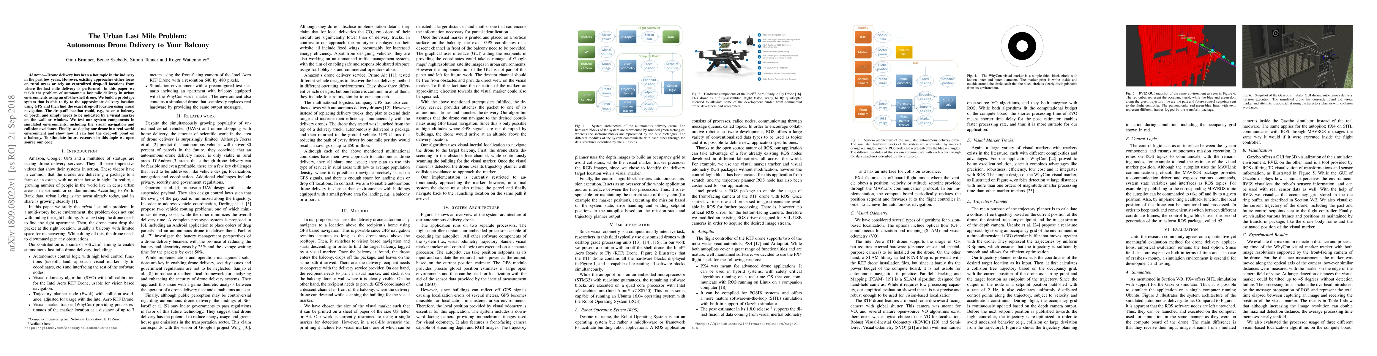 This paper proposes an autonomous drone delivery system for urban last mile delivery, utilizing GPS for initial positioning and visual navigation for precise drop-off on balconies or porches. The system is tested in simulations and real-world environments, demonstrating successful navigation and drop-off, with the authors open-sourcing their code to spur further research.