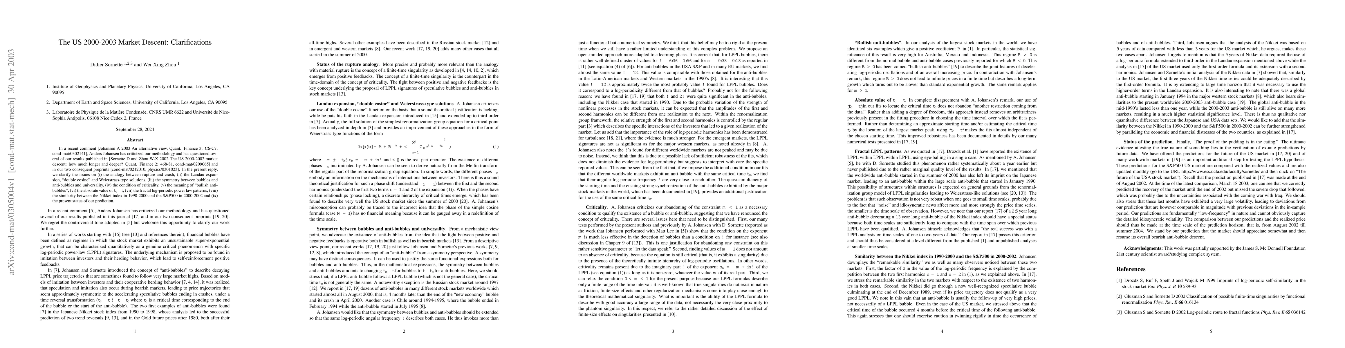 In a recent comment (Johansen A 2003 An alternative view, Quant. Finance 3: C6-C7, cond-mat/0302141), Anders Johansen has criticized our methodology and has questioned several of our results published in [Sornette D and Zhou W-X 2002 The US 2000-2002 market descent: how much longer and deeper? Quant. Finance 2: 468-81, cond-mat/0209065] and in our two consequent preprints [cond-mat/0212010, physics/0301023]. In the present reply, we clarify the issues on (i) the analogy between rupture and crash, (ii) the Landau expansion, ``double cosine'' and Weierstrass-type solutions, (iii) the symmetry between bubbles and anti-bubbles and universality, (iv) the condition of criticality, (v) the meaning of ``bullish anti-bubbles'', (vi) the absolute value of t_c-t, (vii) the fractal log-periodic power law patterns, (viii) the similarity between the Nikkei index in 1990-2000 and the S&P500 in 2000-2002 and (ix) the present status of our prediction.