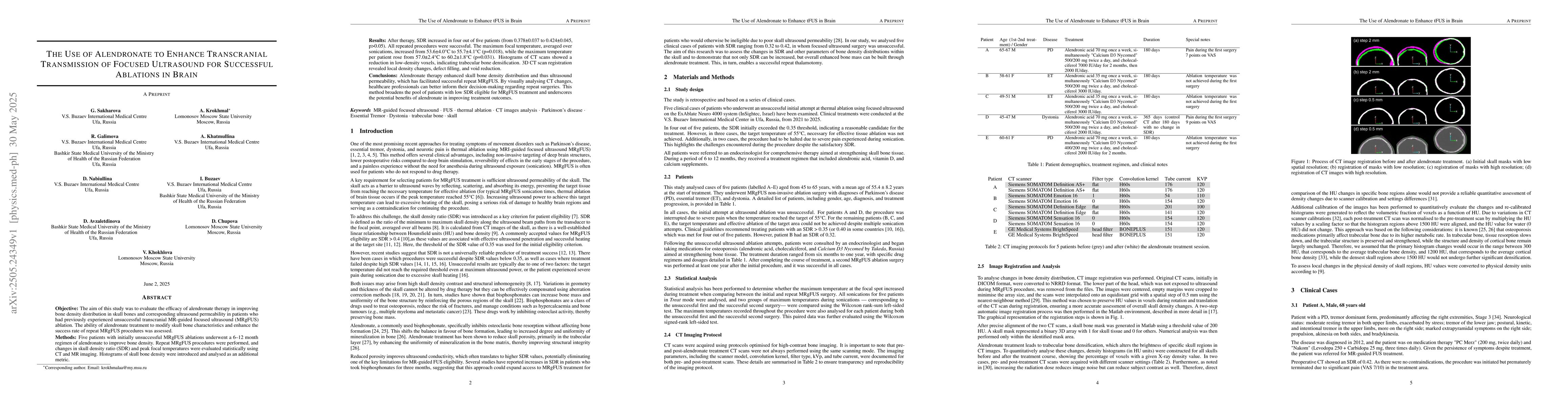 Alendronate therapy enhanced skull bone density distribution and thus ultrasound permeability, facilitating successful repeat MRgFUS. This method broadens the pool of patients with low SDR eligible for MRgFUS treatment and underscores the potential benefits of alendronate in improving treatment outcomes.