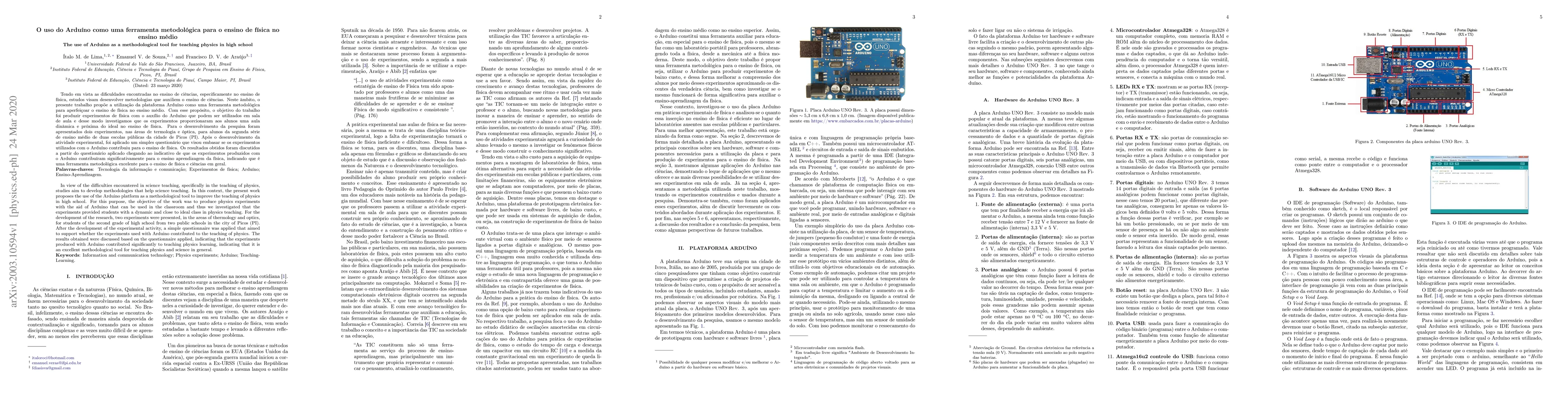 In view of the difficulties encountered in science teaching, specifically in the teaching of physics, studies aim to develop methodologies that help science teaching. In this context, the present work proposes the use of the Arduino platform as a methodological tool to improve the teaching of physics in high school. For this purpose, the objective of the work was to produce physics experiments with the aid of Arduino that can be used in the classroom and thus we investigated that the experiments provided students with a dynamic and close to ideal class in physics teaching. For the development of the research, two experiments were presented, in the areas of thermology and optics, for students of the second grade of high school from two public schools in the city of Picos (PI). After the development of the experimental activity, a simple questionnaire was applied that aimed to support whether the experiments used with Arduino contributed to the teaching of physics. The results obtained were discussed based on the questionnaire applied, indicating that the experiments produced with Arduino contributed significantly to teaching physics learning, indicating that it is an excellent methodological tool for teaching physics and science in general