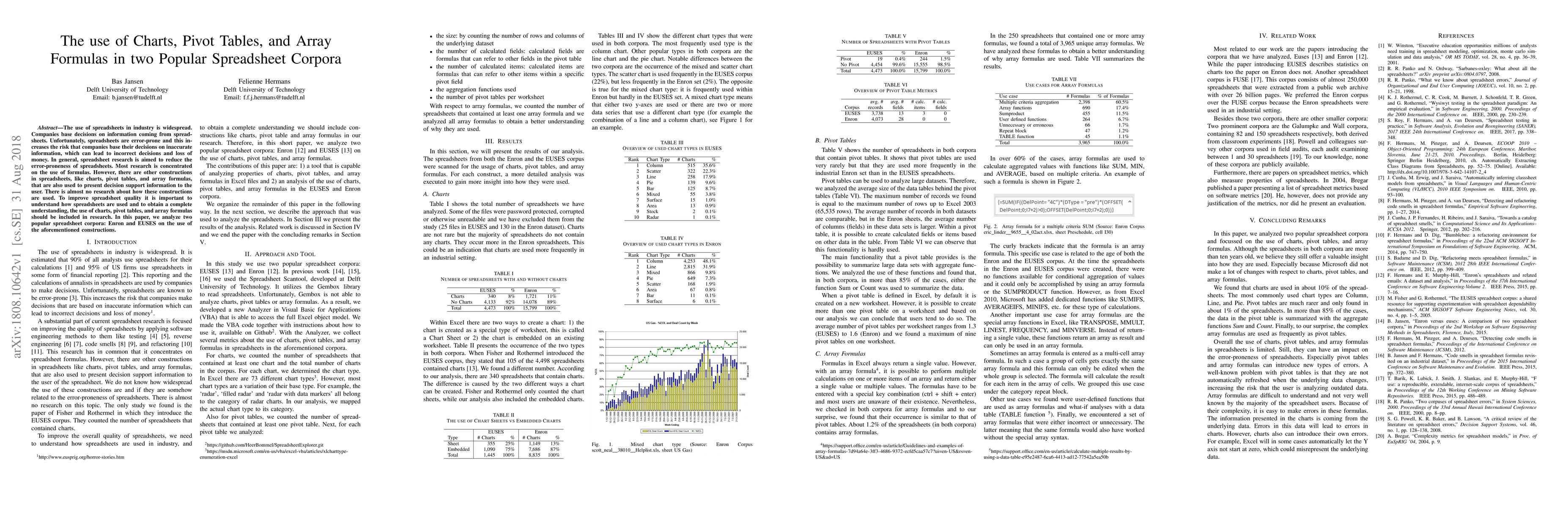 This paper investigates the use of charts, pivot tables, and array formulas in two popular spreadsheet corpora—Enron and EUSES—to understand how these constructions contribute to decision support and to identify potential areas for reducing error-proneness in spreadsheets. The study aims to enhance spreadsheet quality by comprehensively analyzing these under-researched features.