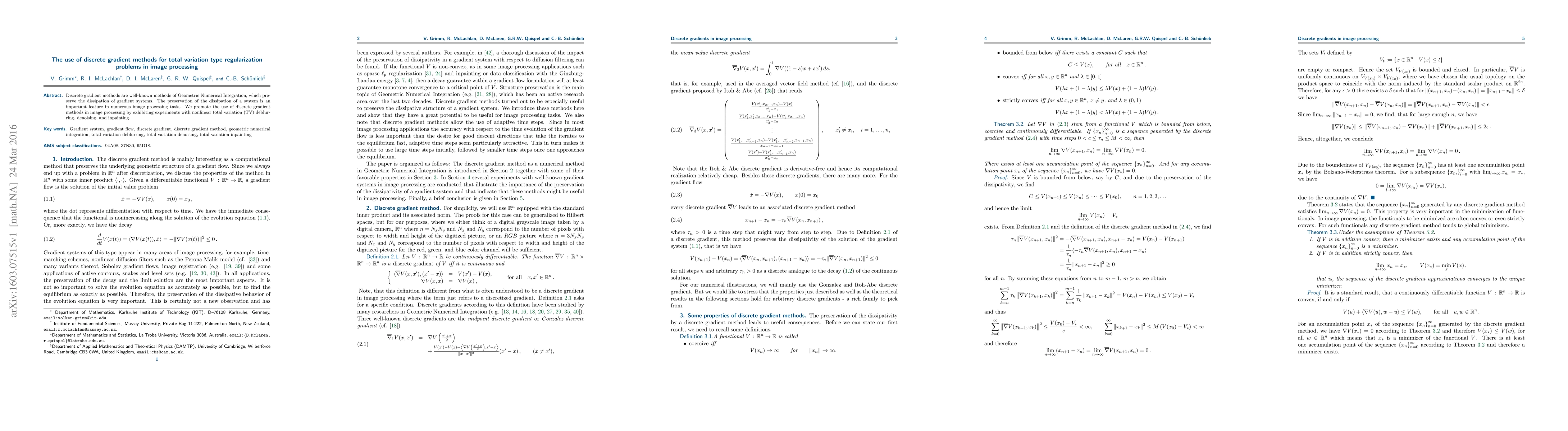 This paper explores using discrete gradient methods for image processing tasks such as deblurring, denoising, and inpainting with total variation regularization, highlighting their ability to preserve dissipation of gradient systems.