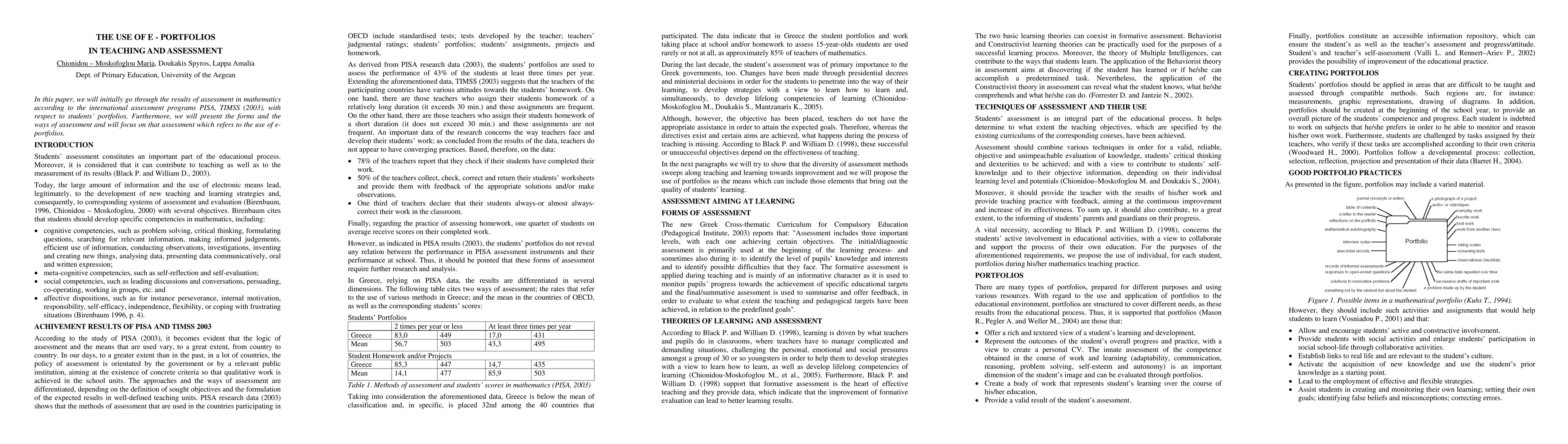 This paper explores the use of e-portfolios in teaching and assessment, focusing on key findings from international assessments like PISA and TIMSS. It examines the forms and methods of e-portfolio assessment to understand its effectiveness in mathematics education.