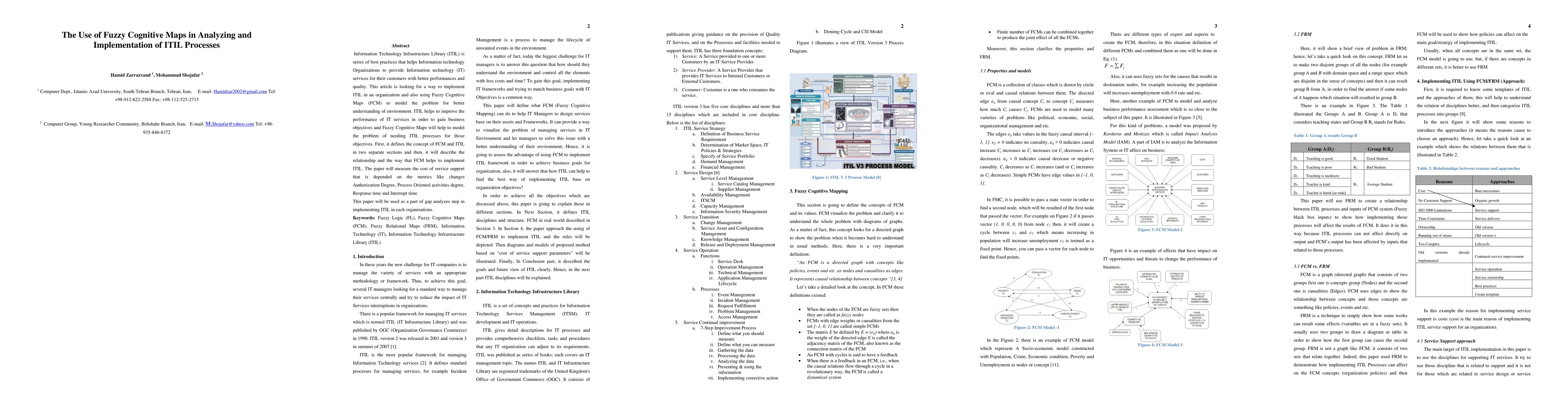 This research paper explores the application of Fuzzy Cognitive Maps in implementing ITIL processes to improve IT service performance and achieve business objectives. It measures the cost of service support using metrics like changes authorization degree and response time.