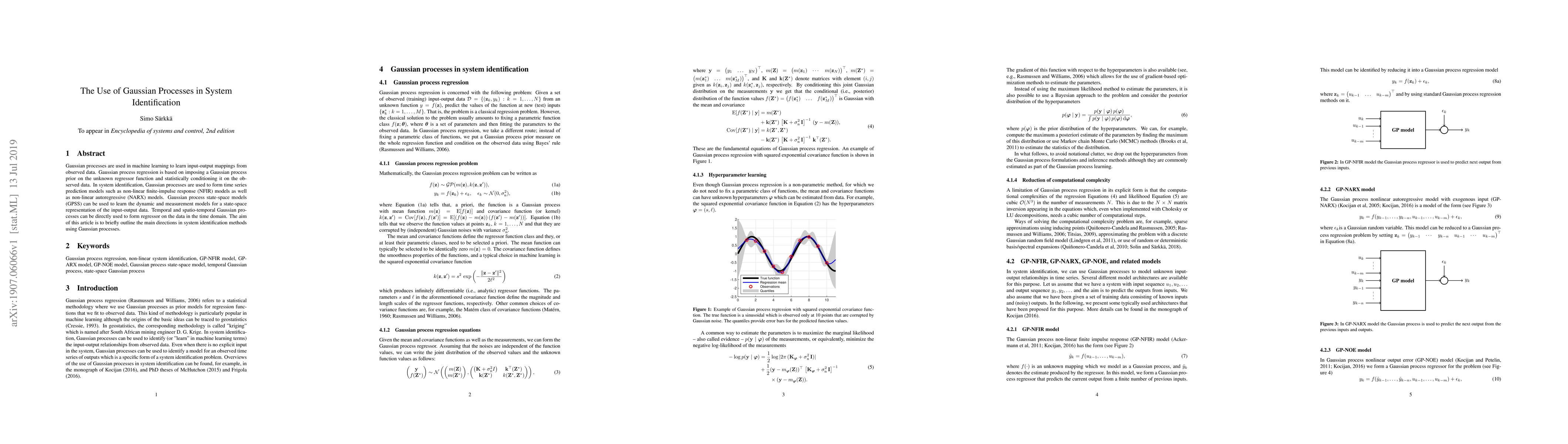 This paper explores the application of Gaussian processes in system identification, focusing on their use in constructing time series prediction models like NFIR and NARX, and state-space models for dynamic input-output data. It highlights the potential of Gaussian processes in forming both temporal and spatio-temporal regression models.