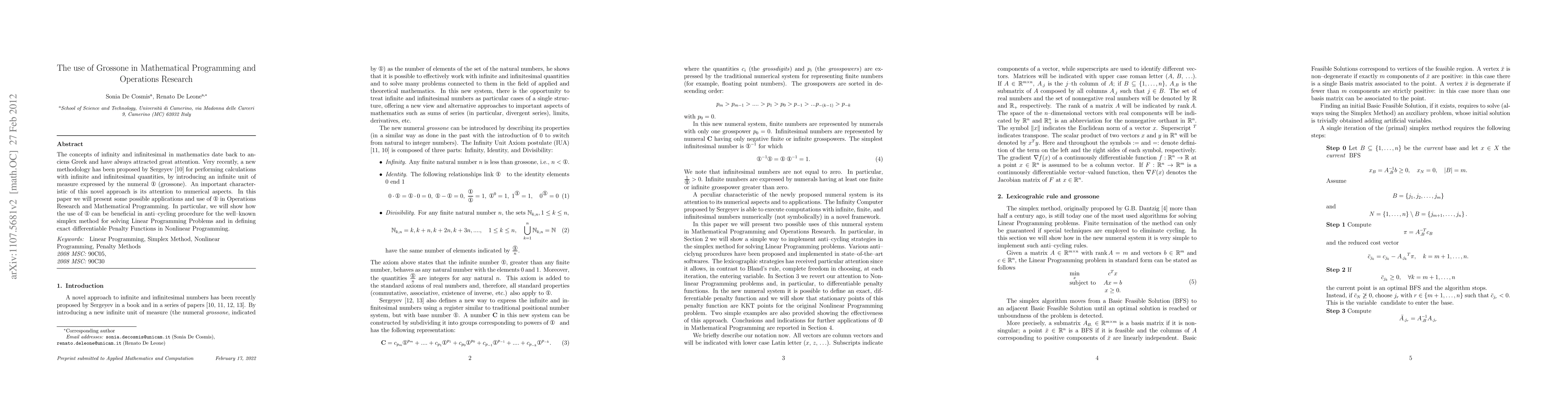 The concepts of infinity and infinitesimal in mathematics date back to anciens Greek and have always attracted great attention. Very recently, a new methodology has been proposed by Sergeyev for performing calculations with infinite and infinitesimal quantities, by introducing an infinite unit of measure expressed by the numeral grossone. An important characteristic of this novel approach is its attention to numerical aspects. In this paper we will present some possible applications and use of grossone in Operations Research and Mathematical Programming. In particular, we will show how the use of grossone can be beneficial in anti--cycling procedure for the well-known simplex method for solving Linear Programming Problems and in defining exact differentiable Penalty Functions in Nonlinear Programming.