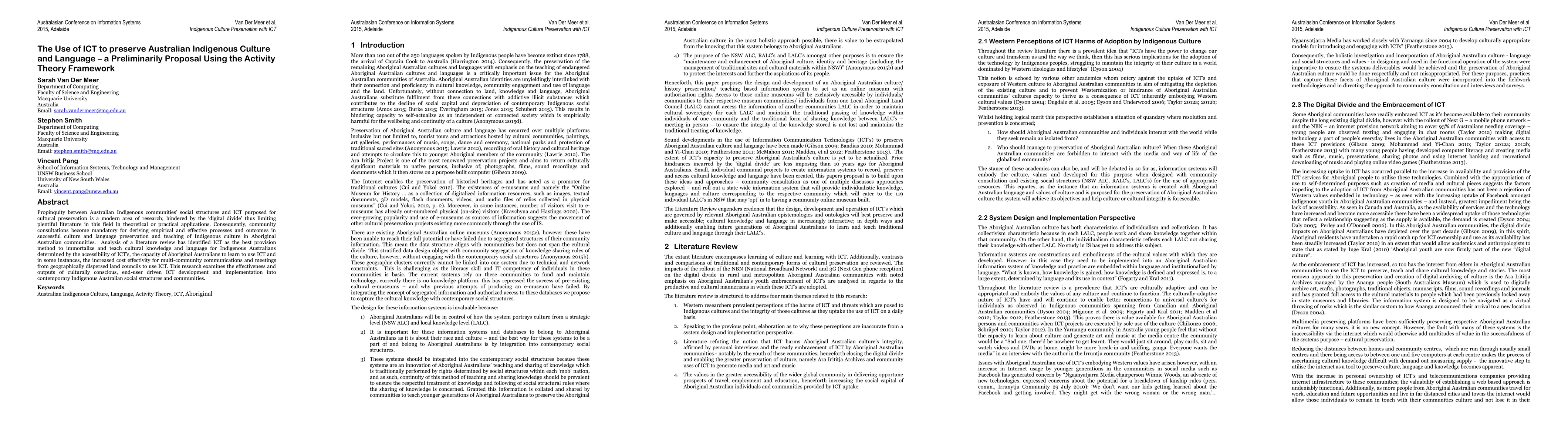 Propinquity between Australian Indigenous communities' social structures and ICT purposed for cultural preservation is a modern area of research; historically hindered by the "digital divide" thus limiting plentiful literature and existing information systems in this field in theoretical and practical applications. Henceforth, community consultation is mandatory in deriving and delivering empirically effective processes in a cultural and language preservation IS tool designed to teach future generations of Indigenous Australians about native culture and language. More than 100 out of 250 languages spoken by Indigenous have become extinct since 1788 (Harrington, 2014) which inaugurates the urgency of this preservation tool. ICT has been identified as the best provision method; by its capacity to best collect, eternize and teach cultural knowledge and language. The aim of this research is to specify requirements and considerations for the development of a socially integrated, culturally conscious, end-user driven IS to preserve Indigenous culture in Australia.