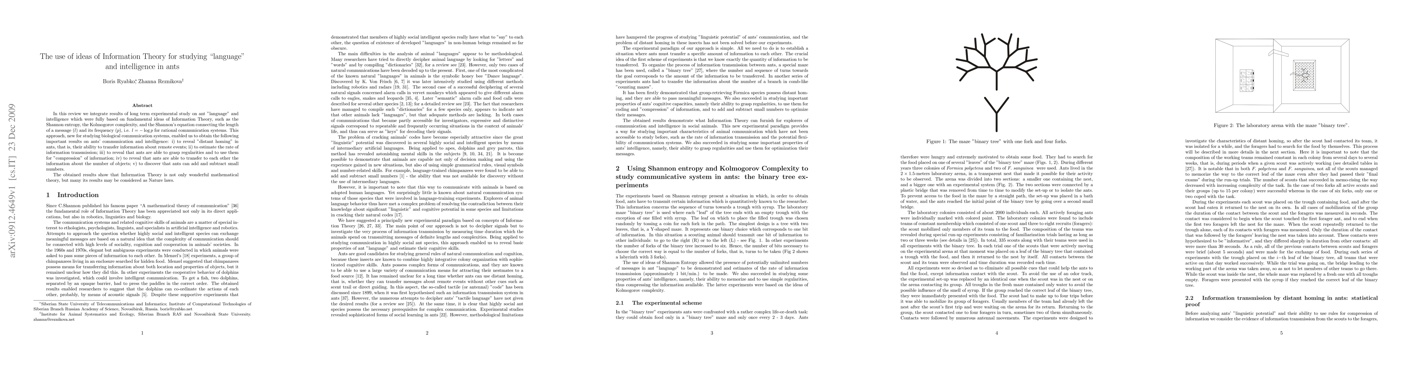 In this review we integrate results of long term experimental study on ant "language" and intelligence which were fully based on fundamental ideas of Information Theory, such as the Shannon entropy, the Kolmogorov complexity, and the Shannon's equation connecting the length of a message ($l$) and its frequency $(p)$, i.e. $l = - \log p$ for rational communication systems. This approach, new for studying biological communication systems, enabled us to obtain the following important results on ants' communication and intelligence: i) to reveal "distant homing" in ants, that is, their ability to transfer information about remote events; ii) to estimate the rate of information transmission; iii) to reveal that ants are able to grasp regularities and to use them for "compression" of information; iv) to reveal that ants are able to transfer to each other the information about the number of objects; v) to discover that ants can add and subtract small numbers. The obtained results show that Information Theory is not only wonderful mathematical theory, but many its results may be considered as Nature laws.