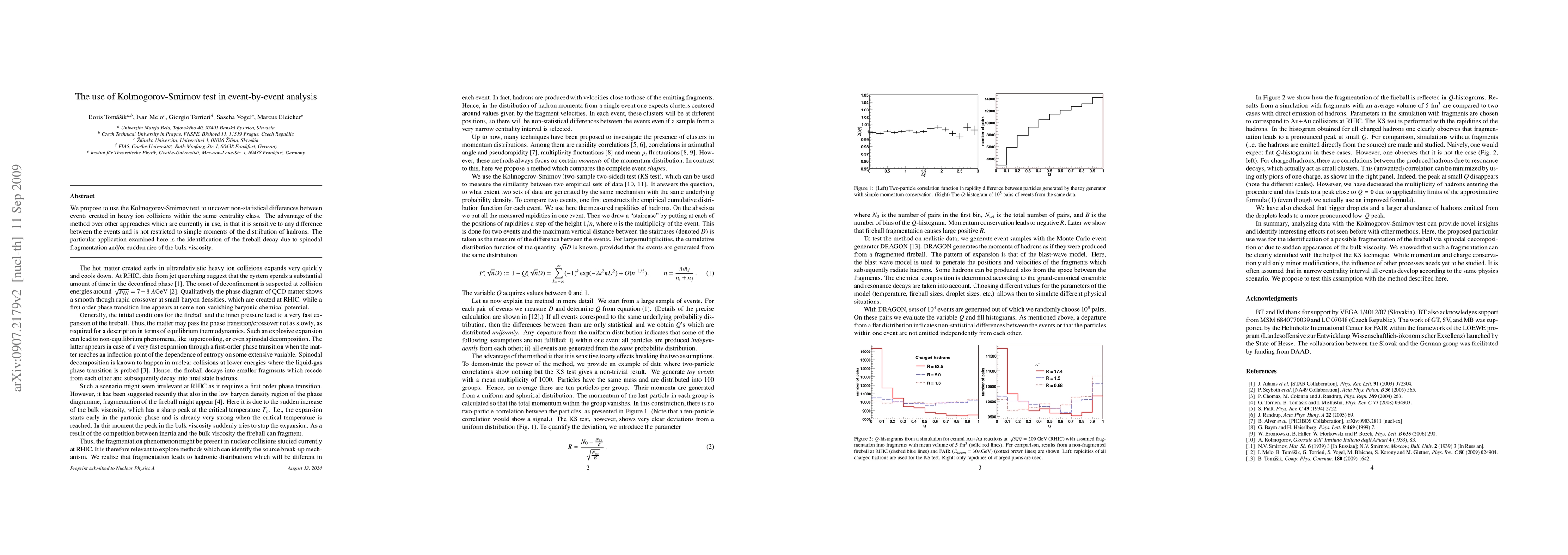 This paper proposes using the Kolmogorov-Smirnov test to detect non-statistical differences in events from heavy ion collisions, offering a more sensitive approach than existing methods. The application focuses on identifying fireball decay through spinodal fragmentation or increased bulk viscosity.