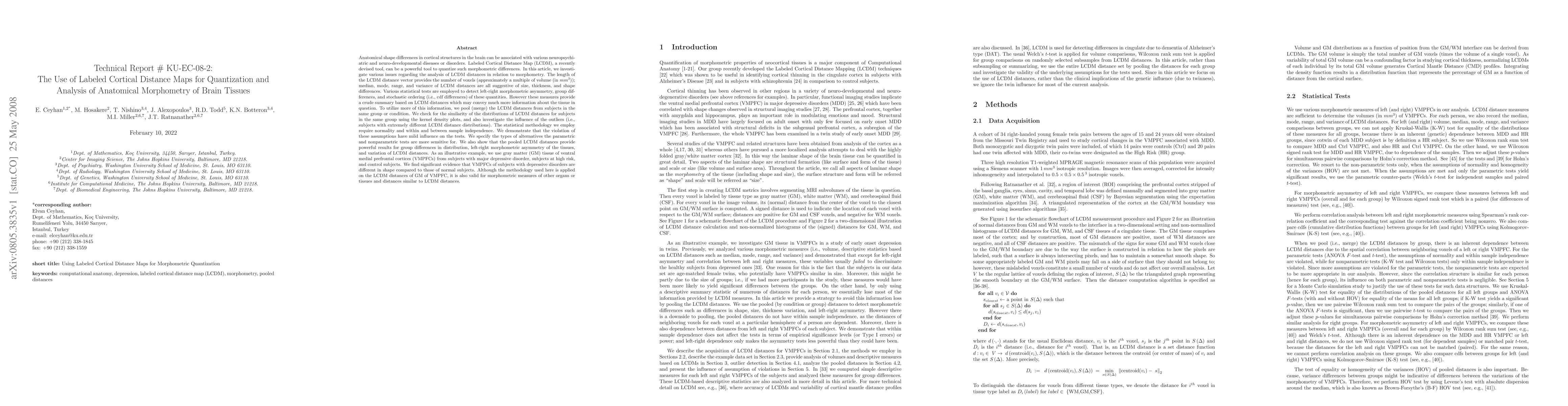 Anatomical shape differences in cortical structures in the brain can be associated with various neuropsychiatric and neuro-developmental diseases or disorders. Labeled Cortical Distance Map (LCDM), can be a powerful tool to quantize such morphometric differences. In this article, we investigate various issues regarding the analysis of LCDM distances in relation to morphometry. The length of the LCDM distance vector provides the number of voxels (approximately a multiple of volume (in mm^3)); median, mode, range, and variance of LCDM distances are all suggestive of size, thickness, and shape differences. However these measures provide a crude summary based on LCDM distances which may convey much more information about the tissue in question. To utilize more of this information, we pool (merge) the LCDM distances from subjects in the same group or condition. The statistical methodology we employ require normality and within and between sample independence. We demonstrate that the violation of these assumptions have mild influence on the tests. We specify the types of alternatives the parametric and nonparametric tests are more sensitive for. We also show that the pooled LCDM distances provide powerful results for group differences in distribution, left-right morphometric asymmetry of the tissues, and variation of LCDM distances. As an illustrative example, we use gray matter (GM) tissue of ventral medial prefrontal cortices (VMPFCs) from subjects with major depressive disorder, subjects at high risk, and control subjects. We find significant evidence that VMPFCs of subjects with depressive disorders are different in shape compared to those of normal subjects.