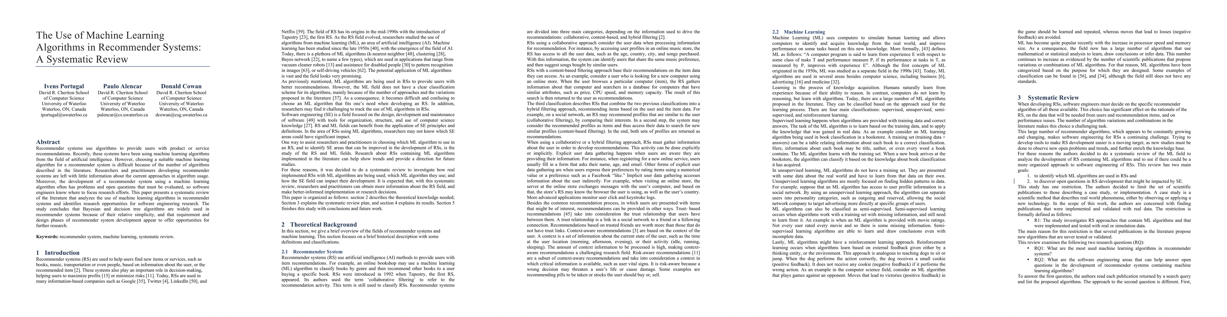 Recommender systems use algorithms to provide users with product or service recommendations. Recently, these systems have been using machine learning algorithms from the field of artificial intelligence. However, choosing a suitable machine learning algorithm for a recommender system is difficult because of the number of algorithms described in the literature. Researchers and practitioners developing recommender systems are left with little information about the current approaches in algorithm usage. Moreover, the development of a recommender system using a machine learning algorithm often has problems and open questions that must be evaluated, so software engineers know where to focus research efforts. This paper presents a systematic review of the literature that analyzes the use of machine learning algorithms in recommender systems and identifies research opportunities for software engineering research. The study concludes that Bayesian and decision tree algorithms are widely used in recommender systems because of their relative simplicity, and that requirement and design phases of recommender system development appear to offer opportunities for further research.