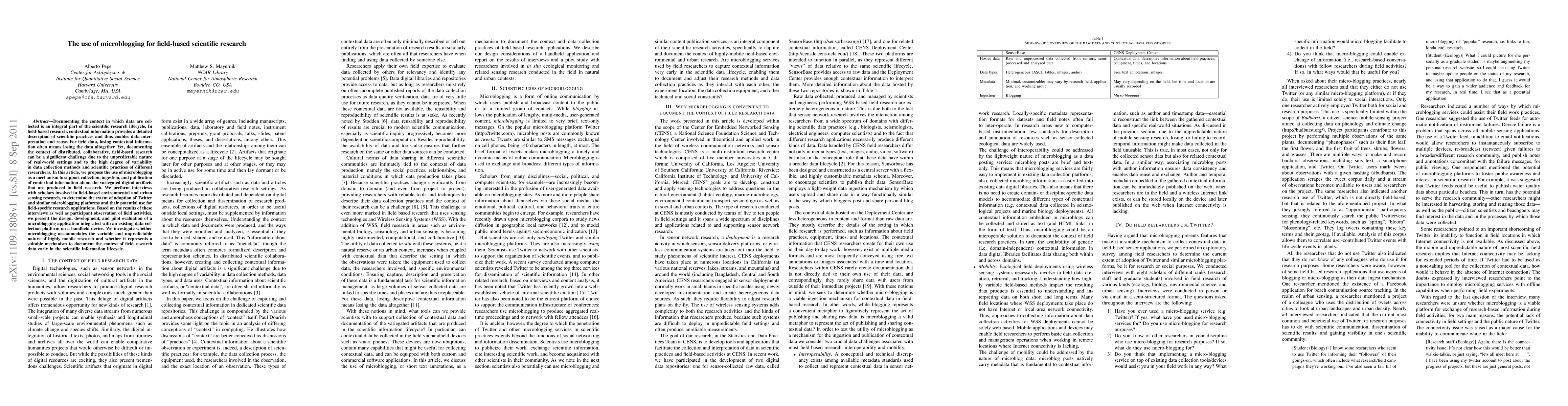 Documenting the context in which data are collected is an integral part of the scientific research lifecycle. In field-based research, contextual information provides a detailed description of scientific practices and thus enables data interpretation and reuse. For field data, losing contextual information often means losing the data altogether. Yet, documenting the context of distributed, collaborative, field-based research can be a significant challenge due to the unpredictable nature of real-world settings and to the high degree of variability in data collection methods and scientific practices of different researchers. In this article, we propose the use of microblogging as a mechanism to support collection, ingestion, and publication of contextual information about the variegated digital artifacts that are produced in field research. We perform interviews with scholars involved in field-based environmental and urban sensing research, to determine the extent of adoption of Twitter and similar microblogging platforms and their potential use for field-specific research applications. Based on the results of these interviews as well as participant observation of field activities, we present the design, development, and pilot evaluation of a microblogging application integrated with an existing data collection platform on a handheld device. We investigate whether microblogging accommodates the variable and unpredictable nature of highly mobile research and whether it represents a suitable mechanism to document the context of field research data early in the scientific information lifecycle.