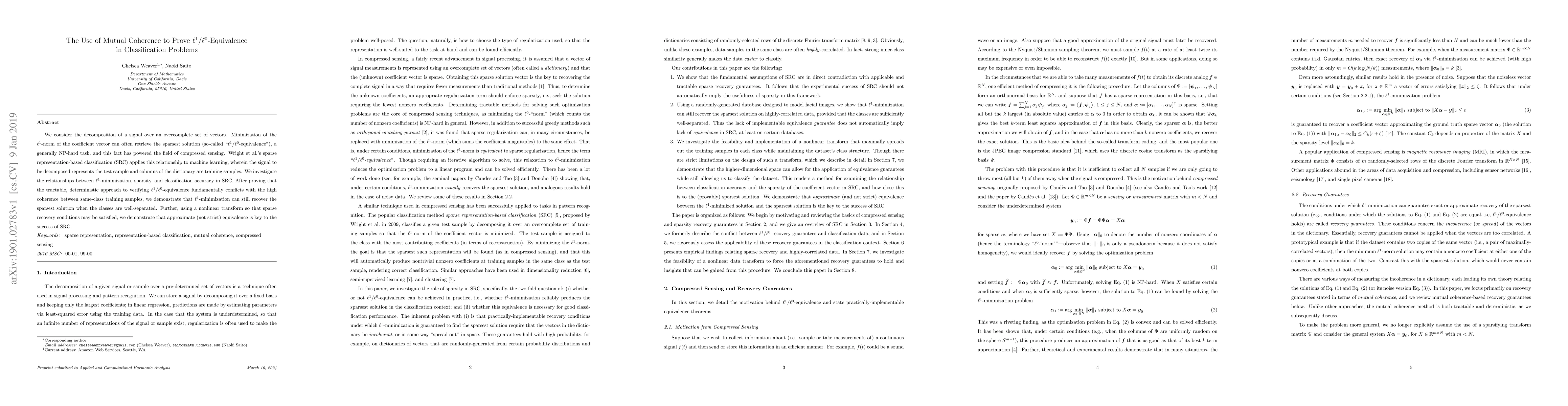We consider the decomposition of a signal over an overcomplete set of vectors. Minimization of the $\ell^1$-norm of the coefficient vector can often retrieve the sparsest solution (so-called "$\ell^1/\ell^0$-equivalence"), a generally NP-hard task, and this fact has powered the field of compressed sensing. Wright et al.'s sparse representation-based classification (SRC) applies this relationship to machine learning, wherein the signal to be decomposed represents the test sample and columns of the dictionary are training samples. We investigate the relationships between $\ell^1$-minimization, sparsity, and classification accuracy in SRC. After proving that the tractable, deterministic approach to verifying $\ell^1/\ell^0$-equivalence fundamentally conflicts with the high coherence between same-class training samples, we demonstrate that $\ell^1$-minimization can still recover the sparsest solution when the classes are well-separated. Further, using a nonlinear transform so that sparse recovery conditions may be satisfied, we demonstrate that approximate (not strict) equivalence is key to the success of SRC.