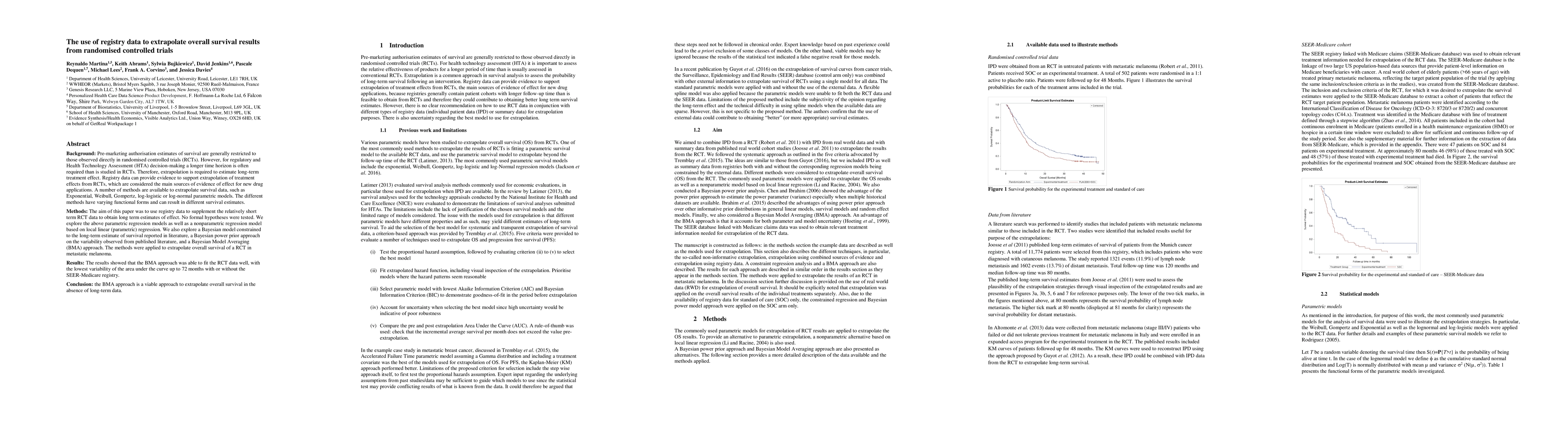This paper explores the use of registry data to extend survival estimates from randomized controlled trials (RCTs) for longer-term regulatory and health technology assessment decisions. The Bayesian Model Averaging (BMA) approach was found to provide the most accurate long-term survival estimates for metastatic melanoma, demonstrating its viability for such extrapolations.