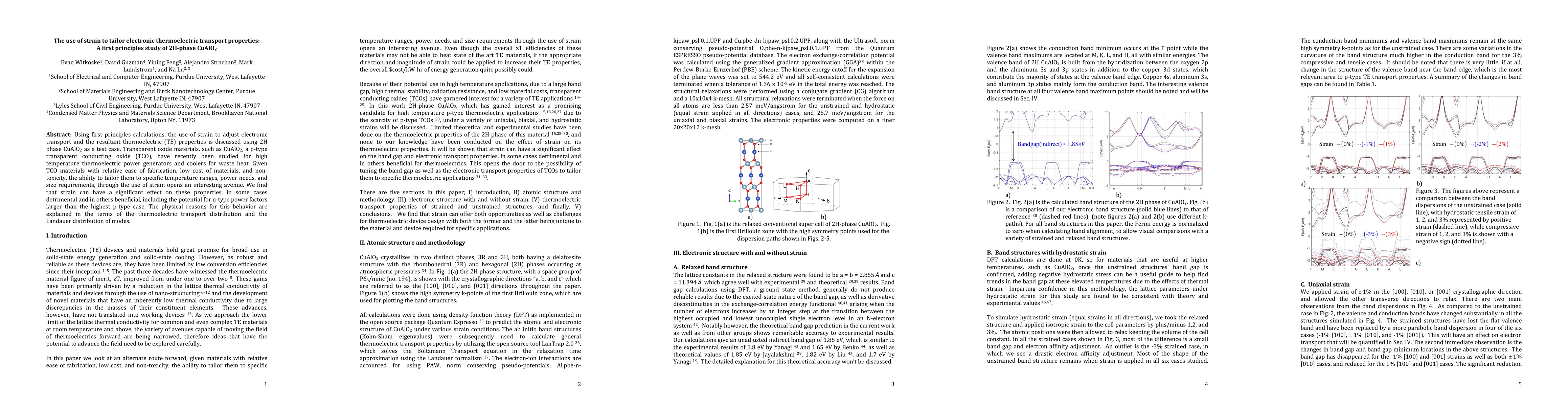 Using first principles calculations, the use of strain to adjust electronic transport and the resultant thermoelectric (TE) properties is discussed using 2H phase CuAlO2 as a test case. Transparent oxide materials, such as CuAlO2, a p-type transparent conducting oxide (TCO), have recently been studied for high temperature thermoelectric power generators and coolers for waste heat. Given TCO materials with relative ease of fabrication, low cost of materials, and non-toxicity, the ability to tailor them to specific temperature ranges, power needs, and size requirements, through the use of strain opens an interesting avenue. We find that strain can have a significant effect on these properties, in some cases detrimental and in others beneficial, including the potential for n-type power factors larger than the highest p-type case. The physical reasons for this behavior are explained in the terms of the thermoelectric transport distribution and the Landauer distribution of modes.