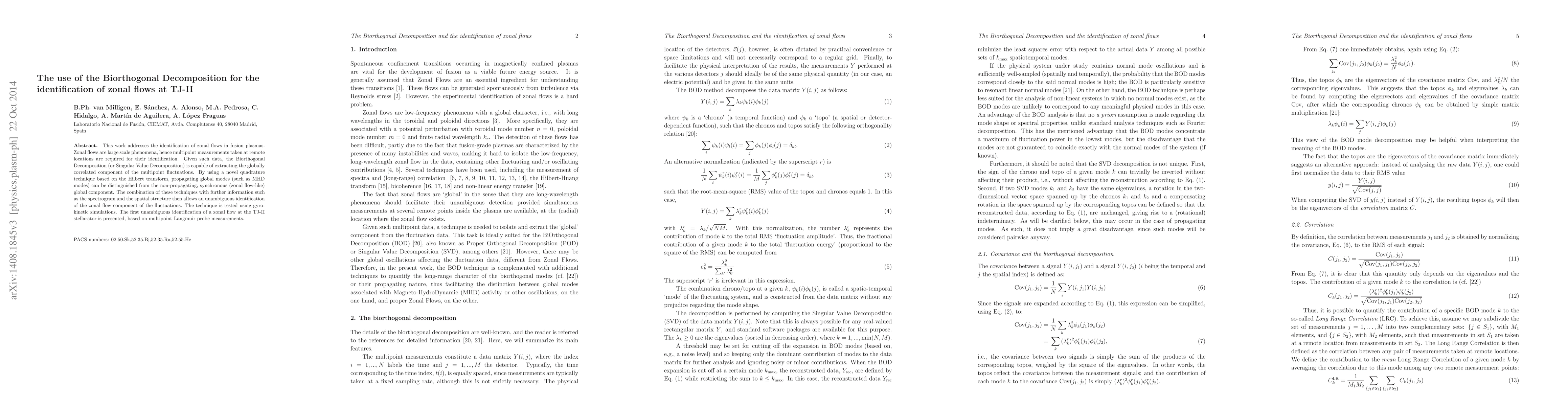 This paper introduces a novel method using Biorthogonal Decomposition and Hilbert transform to identify zonal flows in fusion plasmas, distinguishing them from other global modes. The technique successfully identifies zonal flows in TJ-II stellarator experiments using multipoint Langmuir probe measurements.