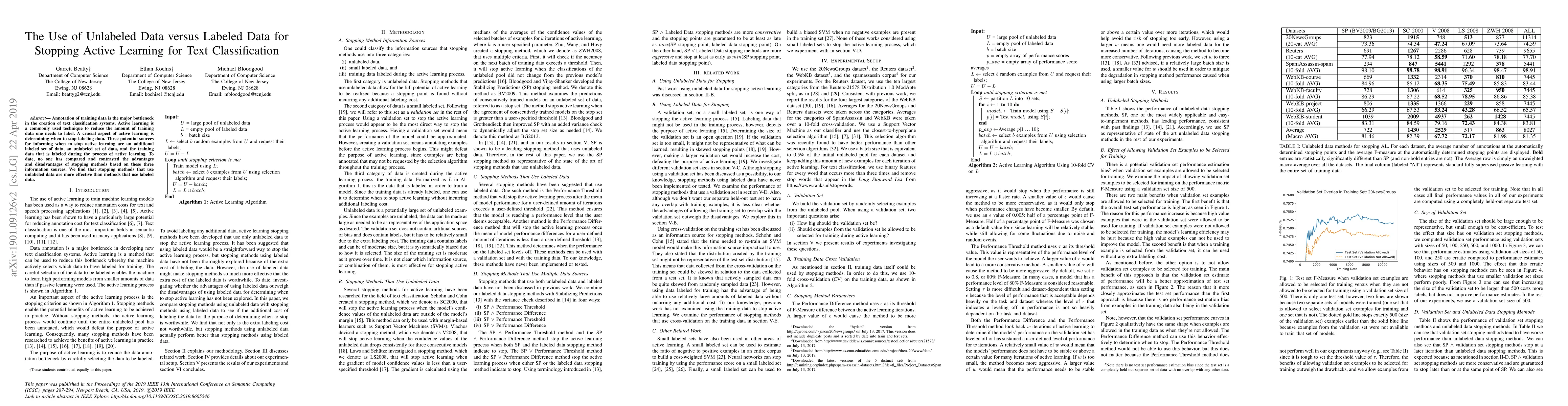 Summary: This study investigates stopping criteria for active learning in text classification, comparing methods based on labeled data, unlabeled data, and in-process training data. The research concludes that stopping methods utilizing unlabeled data are more effective than those relying on labeled data.