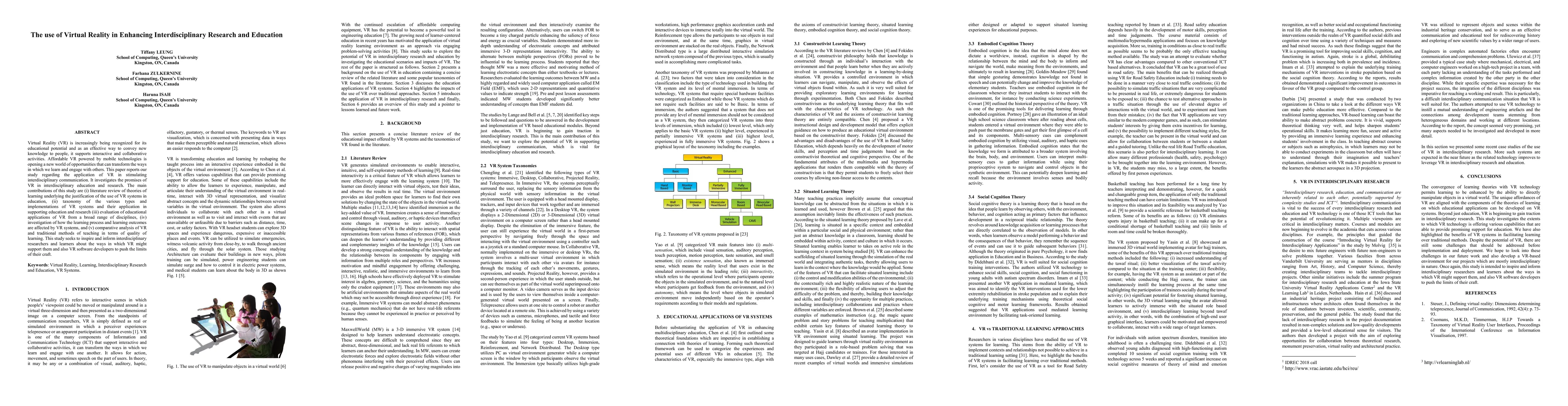 Virtual Reality (VR) is increasingly being recognized for its educational potential and as an effective way to convey new knowledge to people, it supports interactive and collaborative activities. Affordable VR powered by mobile technologies is opening a new world of opportunities that can transform the ways in which we learn and engage with others. This paper reports our study regarding the application of VR in stimulating interdisciplinary communication. It investigates the promises of VR in interdisciplinary education and research. The main contributions of this study are (i) literature review of theories of learning underlying the justification of the use of VR systems in education, (ii) taxonomy of the various types and implementations of VR systems and their application in supporting education and research (iii) evaluation of educational applications of VR from a broad range of disciplines, (iv) investigation of how the learning process and learning outcomes are affected by VR systems, and (v) comparative analysis of VR and traditional methods of teaching in terms of quality of learning. This study seeks to inspire and inform interdisciplinary researchers and learners about the ways in which VR might support them and also VR software developers to push the limits of their craft.