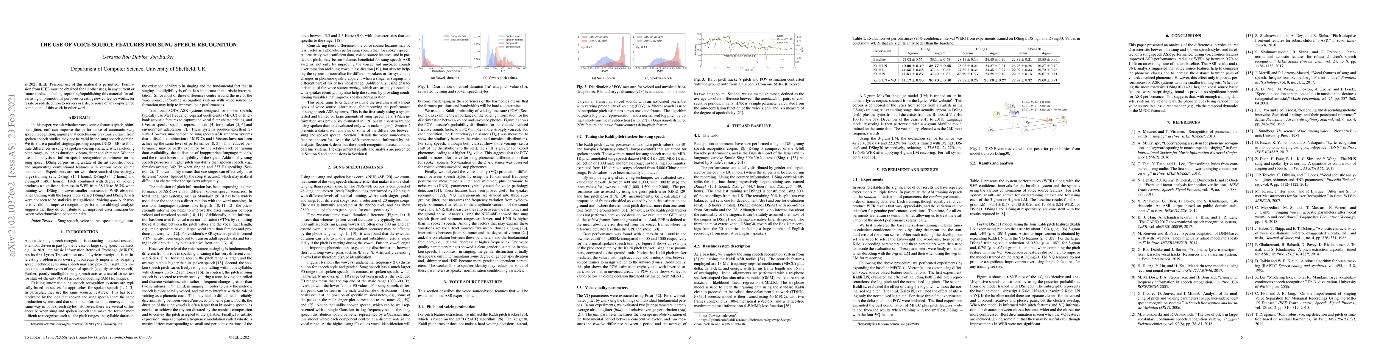 This paper investigates whether vocal source features like pitch, shimmer, and jitter enhance automatic sung speech recognition, finding that while pitch combined with voicing degree significantly reduces word error rate (WER) with smaller datasets, larger datasets do not show statistically significant improvements. The study uses a parallel singing/speaking corpus to analyze differences in sung vs spoken voicing characteristics.
