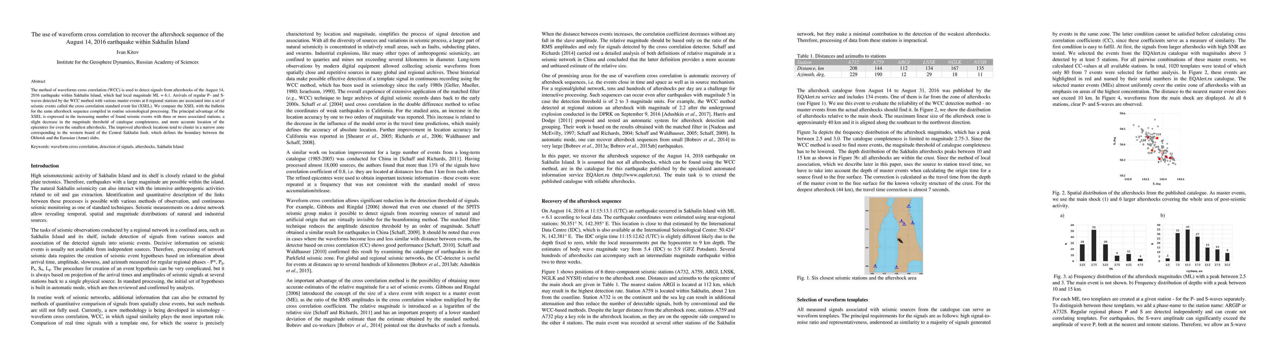 The method of waveforms cross correlation (WCC) is used to detect signals from aftershocks of the August 14, 2016 earthquake within Sakhalin Island, which had local magnitude ML = 6.1. Arrivals of regular P- and S-waves detected by the WCC method with various master events at 6 regional stations are associated into a set of seismic events called the cross correlation standard event list (XSEL). We compare the XSEL with the bulletin for the same aftershock sequence compiled in routine seismological processing. The principal advantage of the XSEL is expressed in the increasing number of found seismic events with three or more associated stations, a slight decrease in the magnitude threshold of catalogue completeness, and more accurate location of the epicentres for even the smallest aftershocks. The improved aftershock locations tend to cluster in a narrow zone corresponding to the western board of the Central Sakhalin fault, which defines the boundary between the Okhotsk and the Eurasian (Amur) slabs.