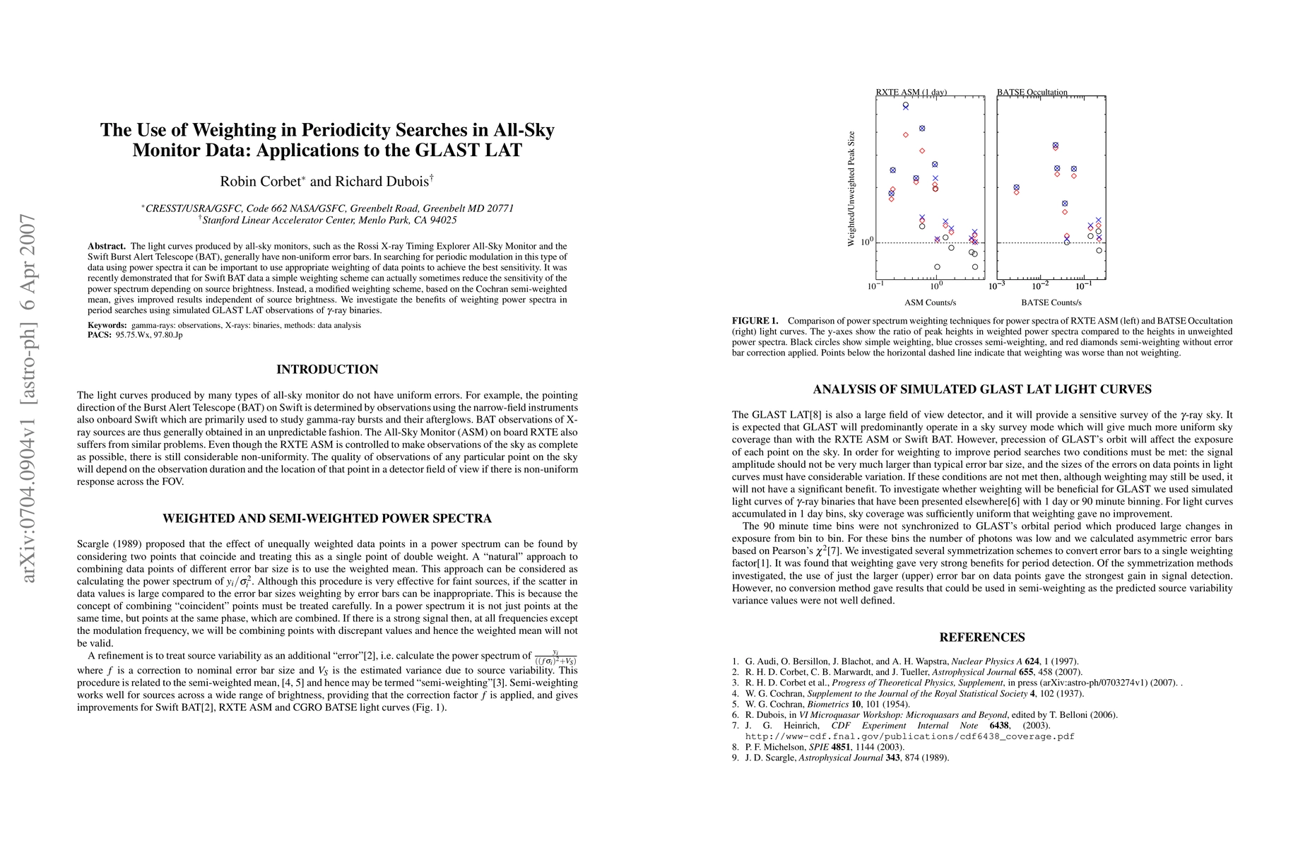 The light curves produced by all-sky monitors, such as the Rossi X-ray Timing Explorer All-Sky Monitor and the Swift Burst Alert Telescope (BAT), generally have non-uniform error bars. In searching for periodic modulation in this type of data using power spectra it can be important to use appropriate weighting of data points to achieve the best sensitivity. It was recently demonstrated that for Swift BAT data a simple weighting scheme can actually sometimes reduce the sensitivity of the power spectrum depending on source brightness. Instead, a modified weighting scheme, based on the Cochran semi-weighted mean, gives improved results independent of source brightness. We investigate the benefits of weighting power spectra in period searches using simulated GLAST LAT observations of gamma-ray binaries.