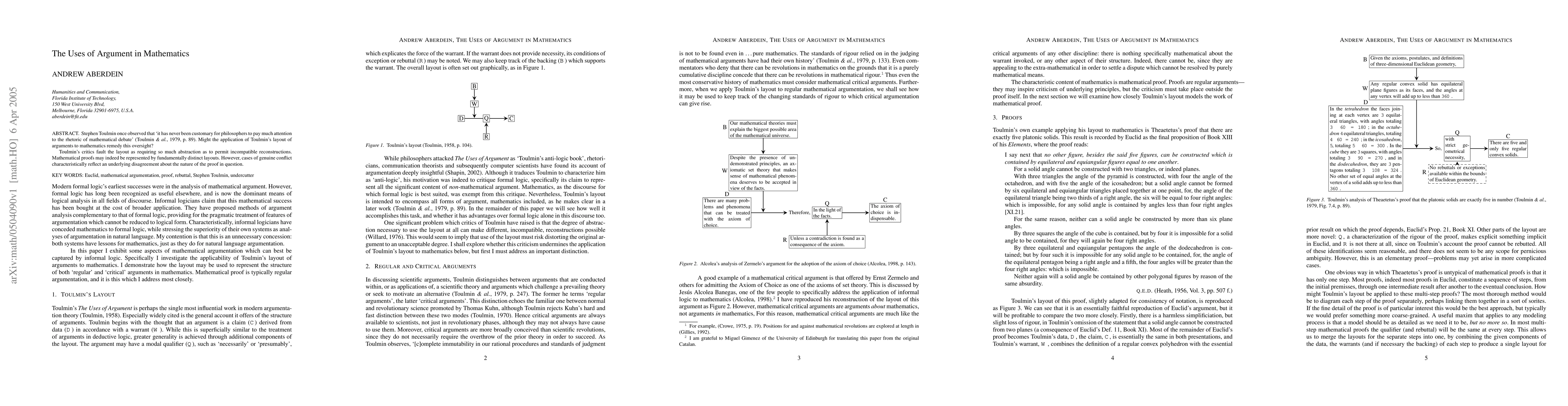 Researchers explored the application of Toulmin's argument layout to mathematical debate, finding that it can help identify underlying disagreements about proof nature, despite variations in representation.