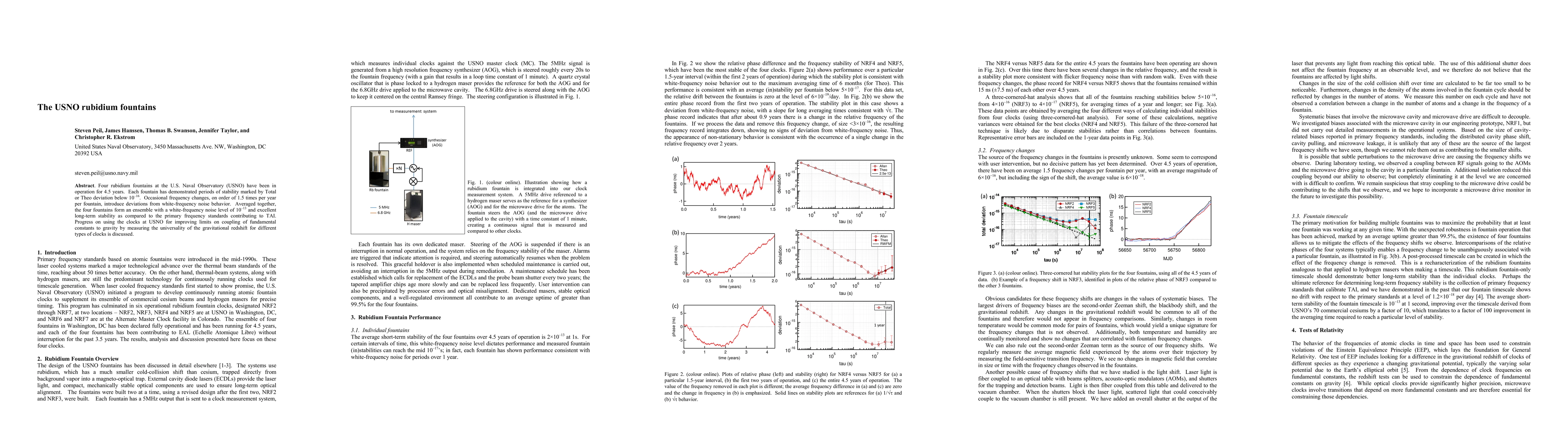 Four rubidium fountains at the U.S. Naval Observatory (USNO) have been in operation for 4.5 years. Each fountain has demonstrated periods of stability marked by Total or Theo deviation below 10^-16. Occasional frequency changes, on order of 1.5 times per year per fountain, introduce deviations from white-frequency noise behavior. Averaged together, the four fountains form an ensemble with a white-frequency noise level of 10^-13 and excellent long-term stability as compared to the primary frequency standards contributing to TAI. Progress on using the clocks at USNO for improving limits on coupling of fundamental constants to gravity by measuring the universality of the gravitational redshift for different types of clocks is discussed.