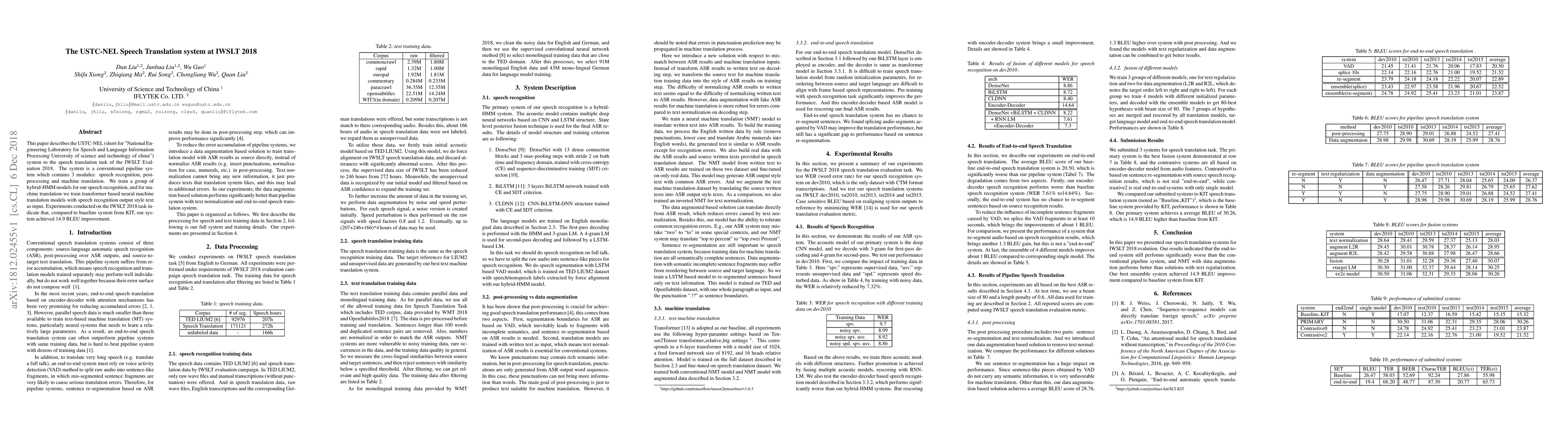 The USTC-NEL system for the IWSLT 2018 speech translation task comprises speech recognition, post-processing, and machine translation modules, achieving a 14.9 BLEU score improvement over the KIT baseline system.