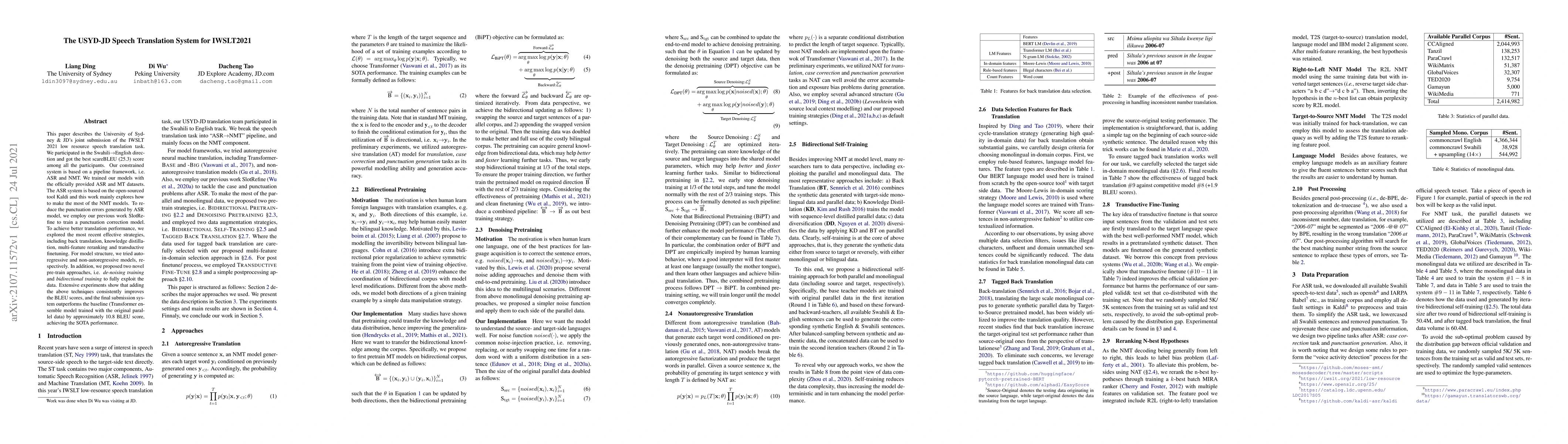 This paper describes the University of Sydney& JD's joint submission of the IWSLT 2021 low resource speech translation task. We participated in the Swahili-English direction and got the best scareBLEU (25.3) score among all the participants. Our constrained system is based on a pipeline framework, i.e. ASR and NMT. We trained our models with the officially provided ASR and MT datasets. The ASR system is based on the open-sourced tool Kaldi and this work mainly explores how to make the most of the NMT models. To reduce the punctuation errors generated by the ASR model, we employ our previous work SlotRefine to train a punctuation correction model. To achieve better translation performance, we explored the most recent effective strategies, including back translation, knowledge distillation, multi-feature reranking and transductive finetuning. For model structure, we tried auto-regressive and non-autoregressive models, respectively. In addition, we proposed two novel pre-train approaches, i.e. \textit{de-noising training} and \textit{bidirectional training} to fully exploit the data. Extensive experiments show that adding the above techniques consistently improves the BLEU scores, and the final submission system outperforms the baseline (Transformer ensemble model trained with the original parallel data) by approximately 10.8 BLEU score, achieving the SOTA performance.