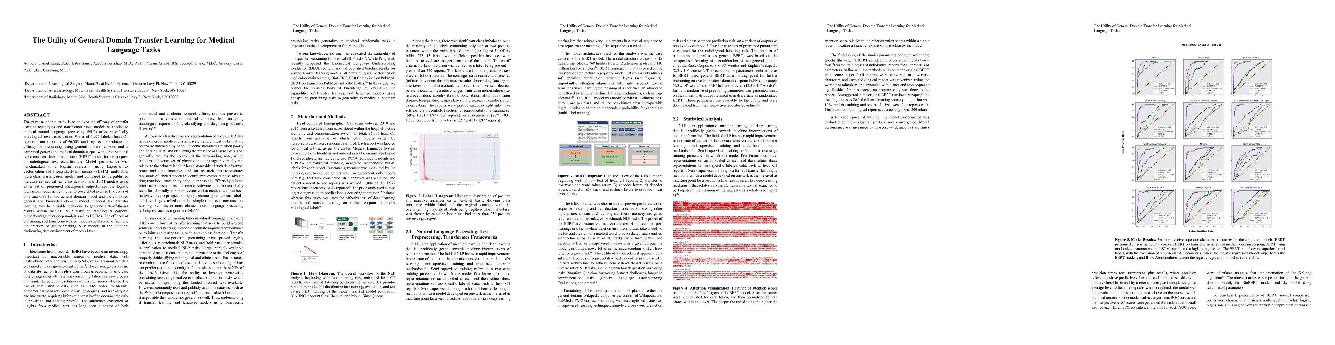 The purpose of this study is to analyze the efficacy of transfer learning techniques and transformer-based models as applied to medical natural language processing (NLP) tasks, specifically radiological text classification. We used 1,977 labeled head CT reports, from a corpus of 96,303 total reports, to evaluate the efficacy of pretraining using general domain corpora and a combined general and medical domain corpus with a bidirectional representations from transformers (BERT) model for the purpose of radiological text classification. Model performance was benchmarked to a logistic regression using bag-of-words vectorization and a long short-term memory (LSTM) multi-label multi-class classification model, and compared to the published literature in medical text classification. The BERT models using either set of pretrained checkpoints outperformed the logistic regression model, achieving sample-weighted average F1-scores of 0.87 and 0.87 for the general domain model and the combined general and biomedical-domain model. General text transfer learning may be a viable technique to generate state-of-the-art results within medical NLP tasks on radiological corpora, outperforming other deep models such as LSTMs. The efficacy of pretraining and transformer-based models could serve to facilitate the creation of groundbreaking NLP models in the uniquely challenging data environment of medical text.