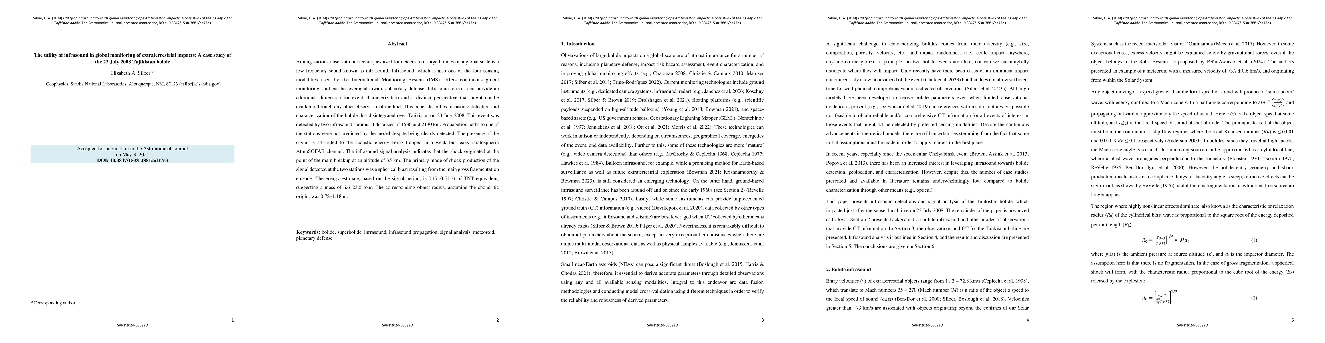 This paper investigates the utility of infrasound for global monitoring of extraterrestrial impacts, focusing on the 2008 Tajikistan bolide event. Infrasound detection from two stations revealed a shock wave originating from the main breakup at 35 km, providing valuable data on the event's energy and size.