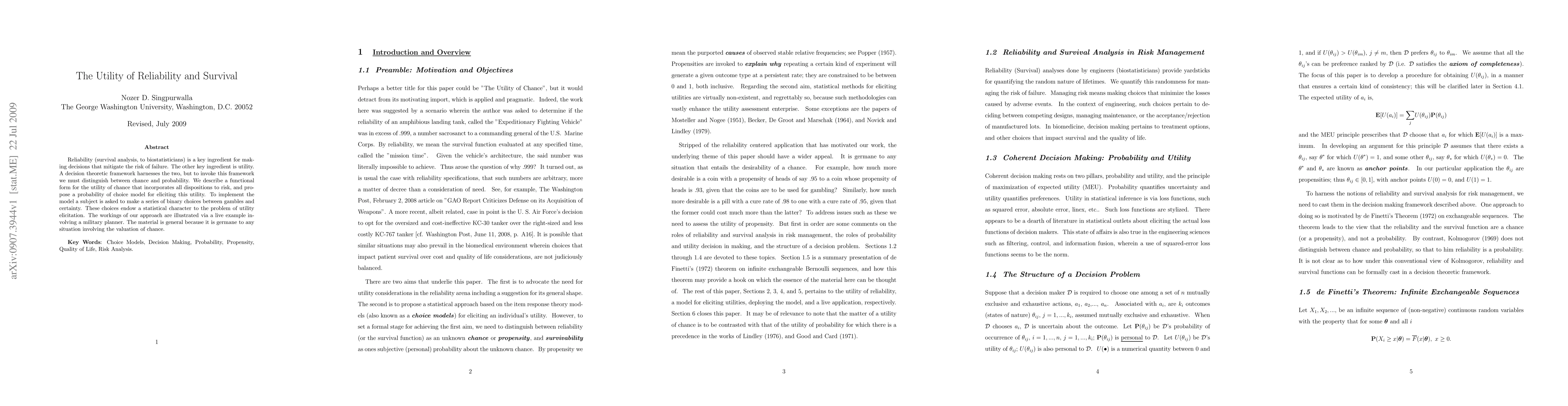 Reliability (survival analysis, to biostatisticians) is a key ingredient for mak- ing decisions that mitigate the risk of failure. The other key ingredient is utility. A decision theoretic framework harnesses the two, but to invoke this framework we must distinguish between chance and probability. We describe a functional form for the utility of chance that incorporates all dispositions to risk, and pro- pose a probability of choice model for eliciting this utility. To implement the model a subject is asked to make a series of binary choices between gambles and certainty. These choices endow a statistical character to the problem of utility elicitation. The workings of our approach are illustrated via a live example in- volving a military planner. The material is general because it is germane to any situation involving the valuation of chance.