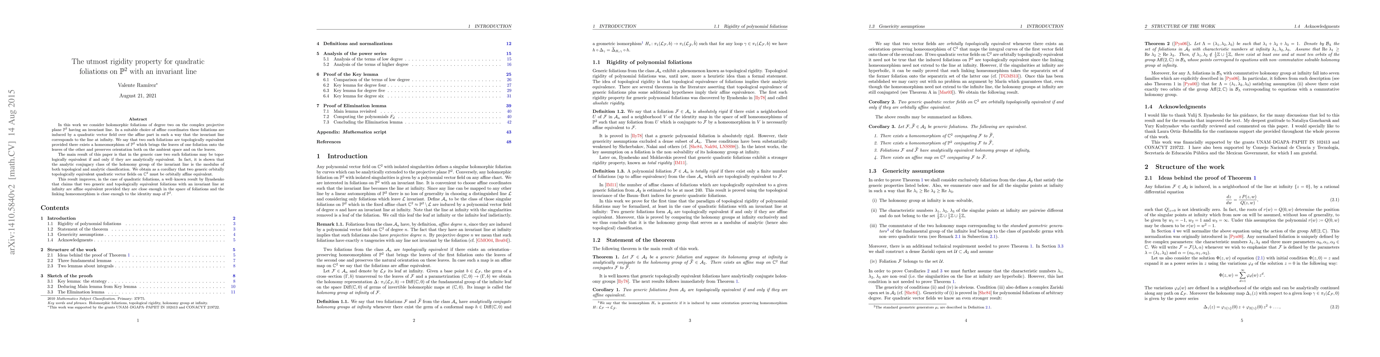 This paper studies holomorphic quadratic foliations on $\mathbb{P}^2$ with an invariant line, proving that generic foliations are topologically equivalent if and only if they are analytically equivalent. The main result establishes that the holonomy group's analytic conjugacy class is the criterion for both topological and analytic classification.