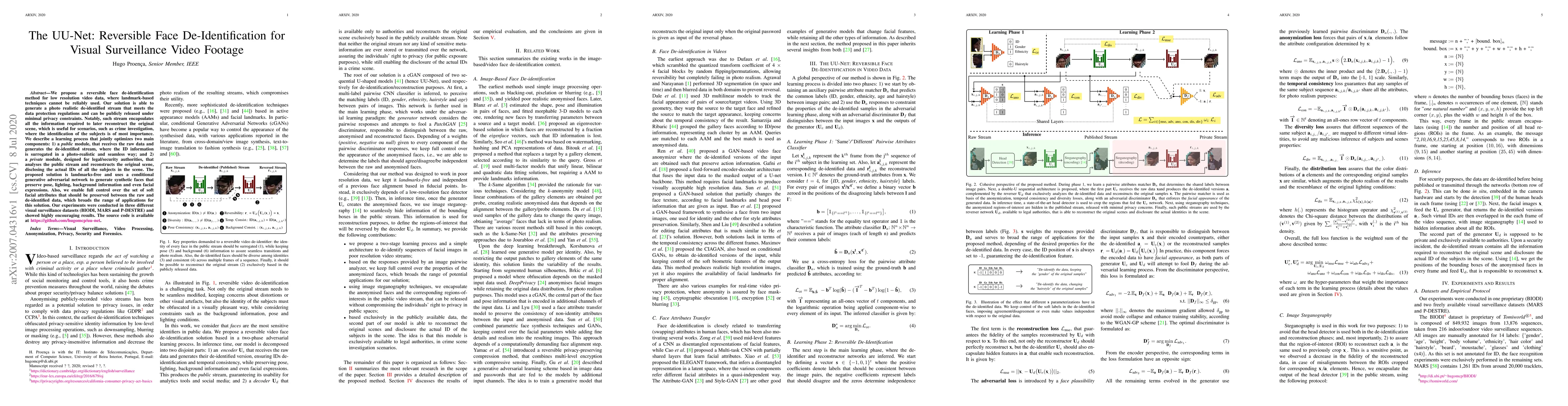 The UU-Net proposes a reversible face de-identification method for low-resolution surveillance footage using a generative adversarial network to create realistic de-identified streams. The method allows for the original scene reconstruction by authorized entities, balancing privacy and investigative needs.