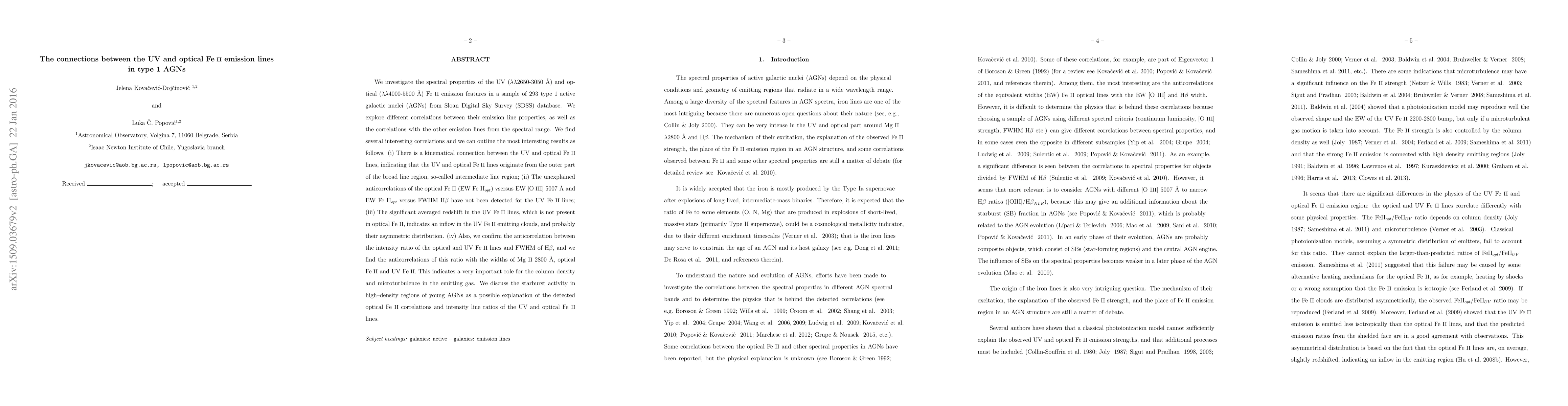 This study of 293 type 1 AGNs from SDSS reveals correlations between UV and optical Fe II emission lines, suggesting an intermediate line region origin. Notable findings include the absence of certain anticorrelations in UV Fe II, a redshift indicating inflow in UV Fe II clouds, and anticorrelations pointing to column density and microturbulence importance. The research also explores starburst activity as a potential explanation for the detected optical Fe II correlations.