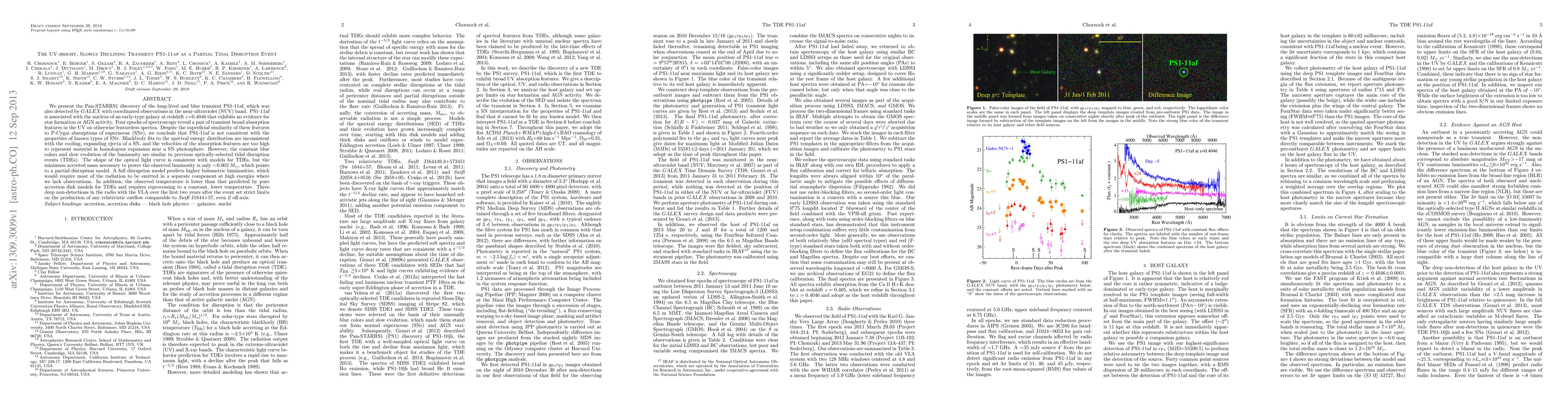 The research paper presents PS1-11af, a unique transient event associated with a non-active galaxy's nucleus. Unlike supernovae, it exhibits slowly declining UV luminosity, constant blue colors, and high-velocity absorption features, suggesting a partial tidal disruption event (TDE). Radio observations ruled out significant relativistic outflow, supporting the partial TDE model over full disruption theories.