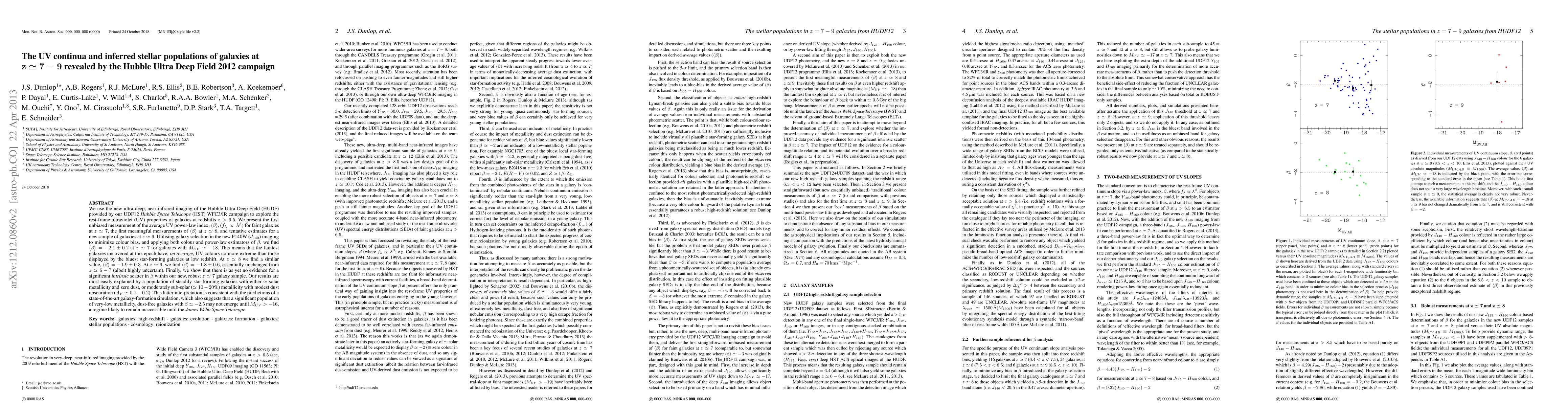 This study uses the Hubble Ultra Deep Field 2012 campaign to analyze the UV continua of galaxies at redshifts z ~ 7-9, finding average UV power-law indices of beta = -2.1 (+/-0.2) at z ~ 7, -1.9 (+/-0.3) at z ~ 8, and -1.8 (+/-0.6) at z ~ 9, suggesting steady star-forming populations with low metallicity and minimal dust.