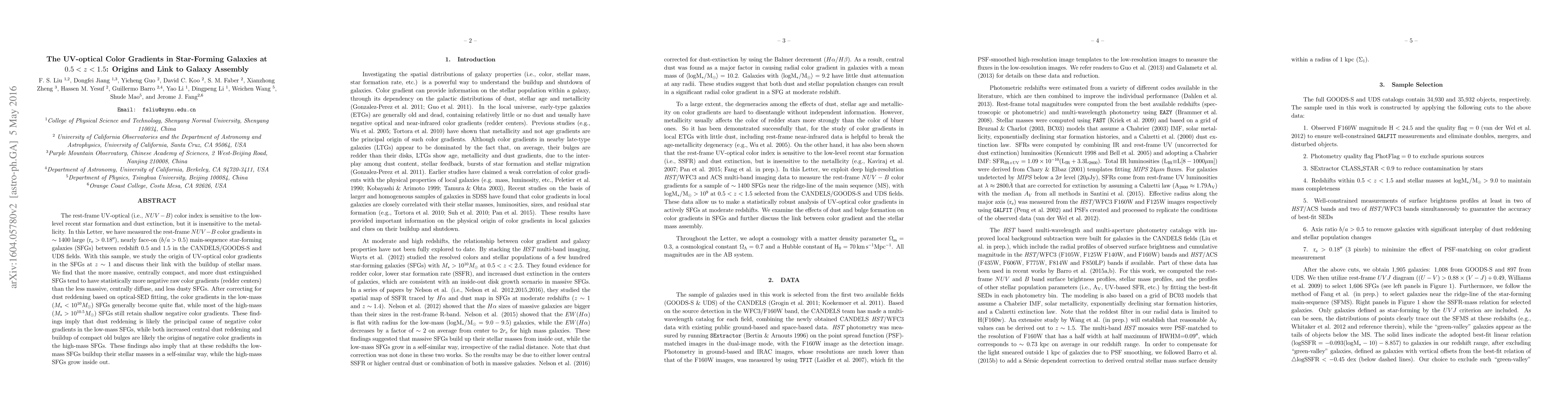This paper investigates UV-optical color gradients in star-forming galaxies at redshifts 0.5 to 1.5, finding that low-mass galaxies show flat color gradients after dust correction, suggesting self-similar mass buildup, while high-mass galaxies retain negative gradients, indicating growth from the center outwards.