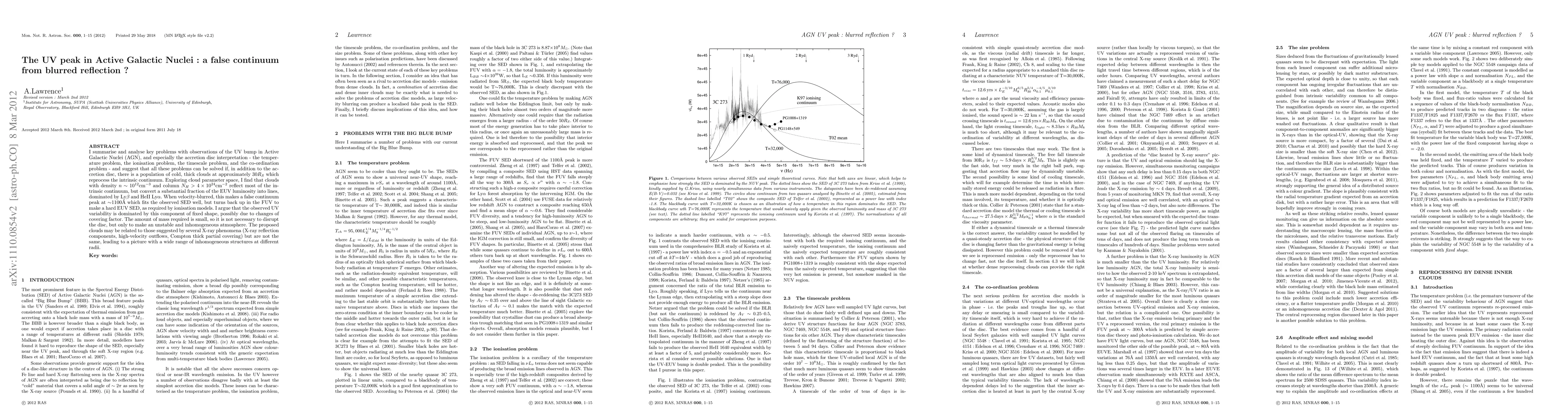 This paper addresses the UV bump in Active Galactic Nuclei (AGN) and proposes that it may result from blurred reflection by cold, dense clouds rather than an accretion disc. These clouds convert EUV luminosity into lines, creating a false continuum peak that fits the observed spectral energy distribution (SED) and resolves various observational problems.