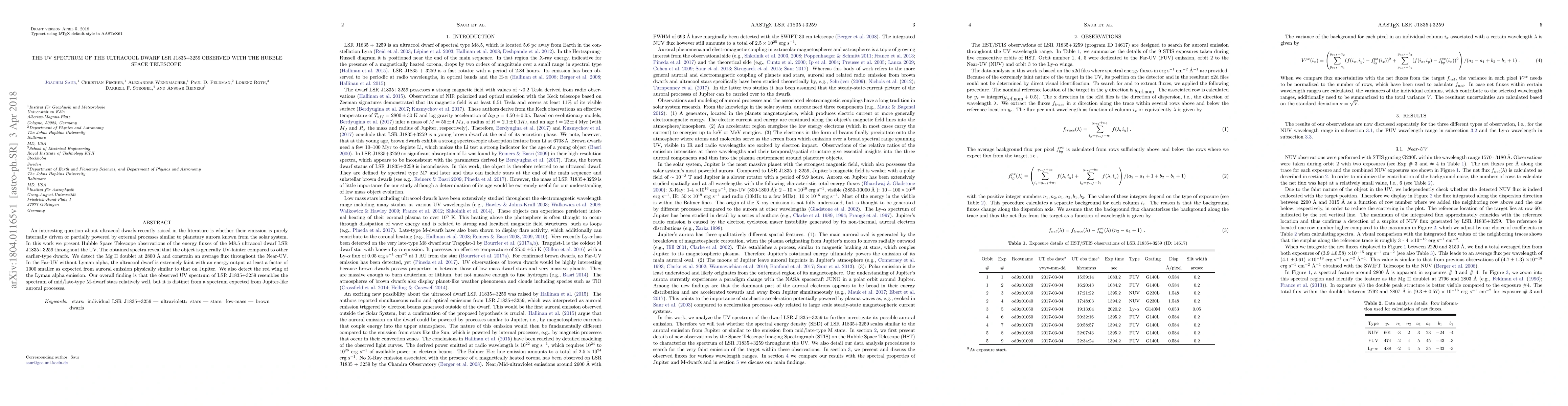 An interesting question about ultracool dwarfs recently raised in the literature is whether their emission is purely internally driven or partially powered by external processes similar to planetary aurora known from the solar system. In this work we present Hubble Space Telescope observations of the energy fluxes of the M8.5 ultracool dwarf LSR J1835+3259 throughout the UV. The obtained spectra reveal that the object is generally UV-fainter compared to other earlier-type dwarfs. We detect the \ion{Mg}{2} doublet at 2800 \A and constrain an average flux throughout the Near-UV. In the Far-UV without Lyman alpha, the ultracool dwarf is extremely faint with an energy output at least a factor of 1000 smaller as expected from auroral emission physically similar to that on Jupiter. We also detect the red wing of the Lyman alpha emission. Our overall finding is that the observed UV spectrum of LSR J1835+3259 resembles the spectrum of mid/late-type M-dwarf stars relatively well, but it is distinct from a spectrum expected from Jupiter-like auroral processes.