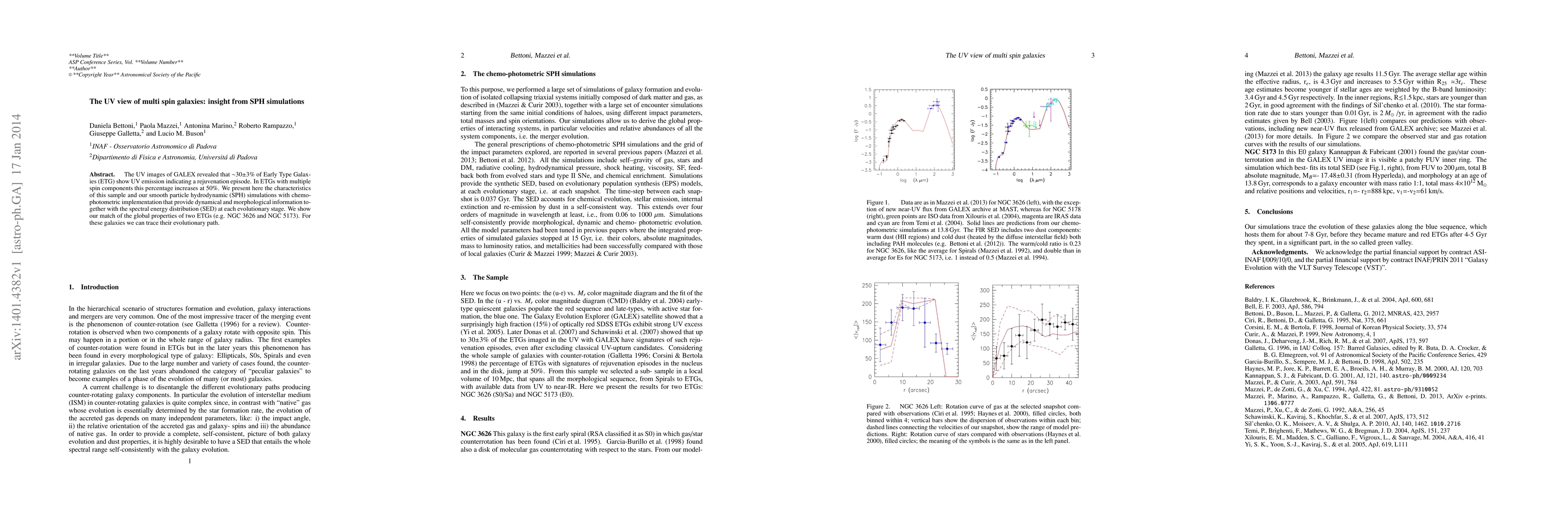 The UV images of GALEX revealed that ~30% of Early Type Galaxies (ETG) show UV emission indicating a rejuvenation episode. In ETGs with multiple spin components this percentage increases at 50%. We present here the characteristics of this sample and our smooth particle hydrodynamic (SPH) simulations with chemo-photometric implementation that provide dynamical and morphological information together with the spectral energy distribution (SED) at each evolutionary stage. We show our match of the global properties of two ETGs (e.g. NGC 3626 and NGC 5173). For these galaxies we can trace their evolutionary path.
