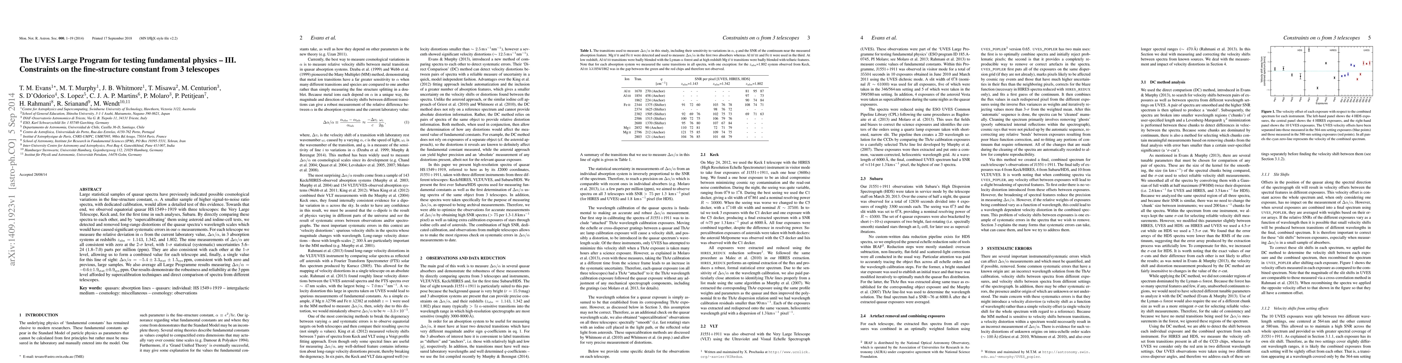 Researchers tested the fine-structure constant in quasar spectra using three telescopes, finding no significant variation at a 3-part-per-million level, demonstrating robust supercalibration techniques.