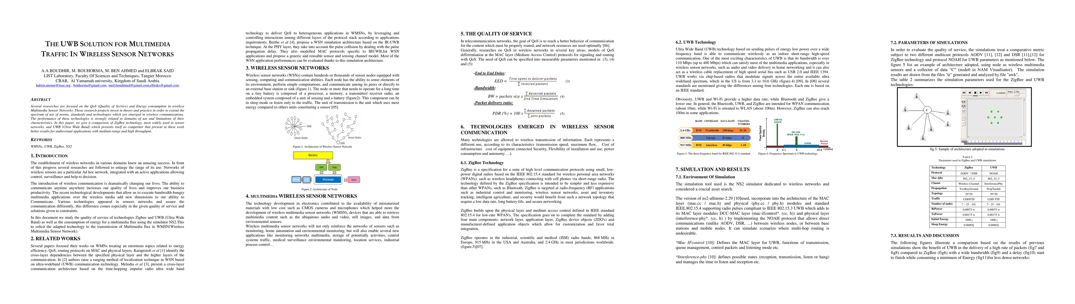 This paper compares ZigBee and UWB technologies for multimedia traffic in wireless sensor networks, finding that UWB offers superior performance for medium-range audiovisual applications due to its high throughput. The study highlights the potential of UWB as a competitor to ZigBee in this domain.