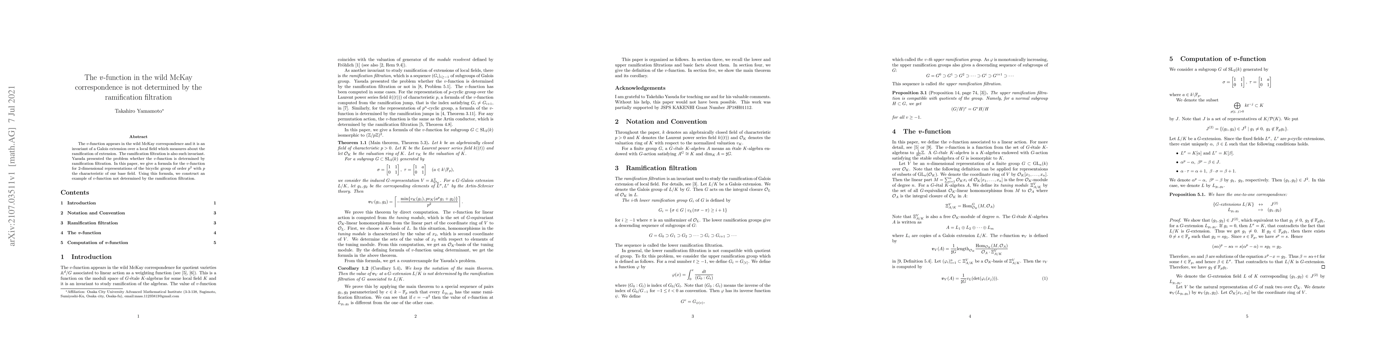 The \(v\)-function appears in the wild McKay correspondence and it is an invariant of a Galois extension over a local field which measures about the ramification of extension. The ramification filtration is also such invariant. Yasuda presented the problem whether the \(v\)-function is determined by ramification filtration. In this paper, we give a formula for the \(v\)-function for 2-dimensional representations of the bicyclic group of order \(p^2\) with \(p\) the characteristic of our base field. Using this formula, we construct an example of \(v\)-function not determined by the ramification filtration.