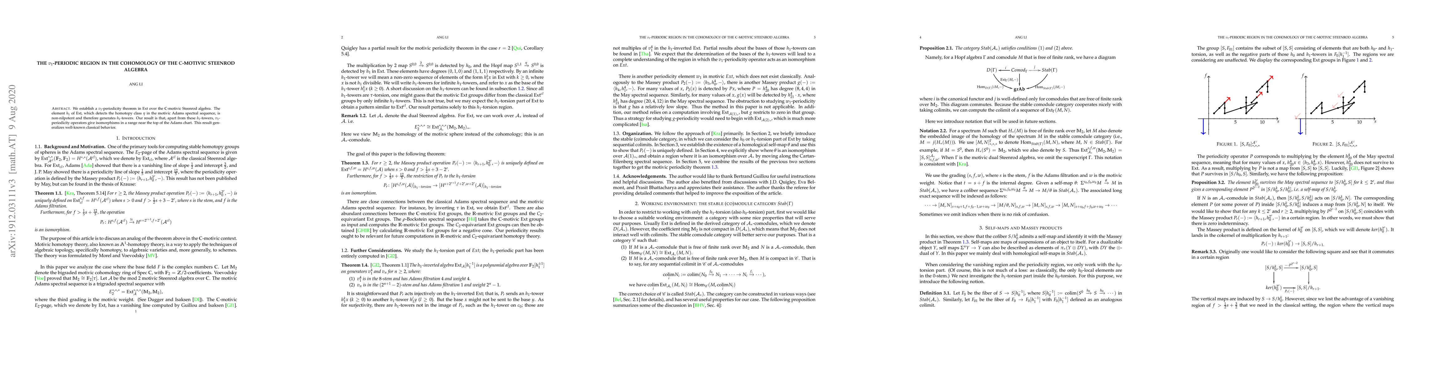This paper proves a $v_1$-periodicity theorem in Ext over the complex-motivic Steenrod algebra, showing that the non-nilpotent element $h_1$ generates $h_1$-towers while $v_1$-periodicity behaves classically outside these towers.