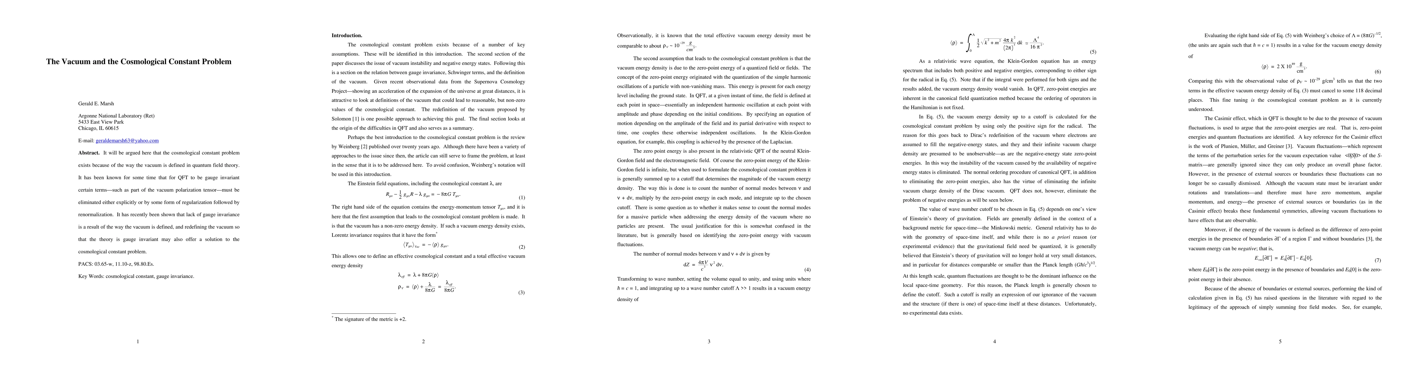 This paper argues that the cosmological constant problem arises from the current definition of the vacuum in quantum field theory, which lacks gauge invariance. Redefining the vacuum to restore gauge invariance may provide a solution to this problem.