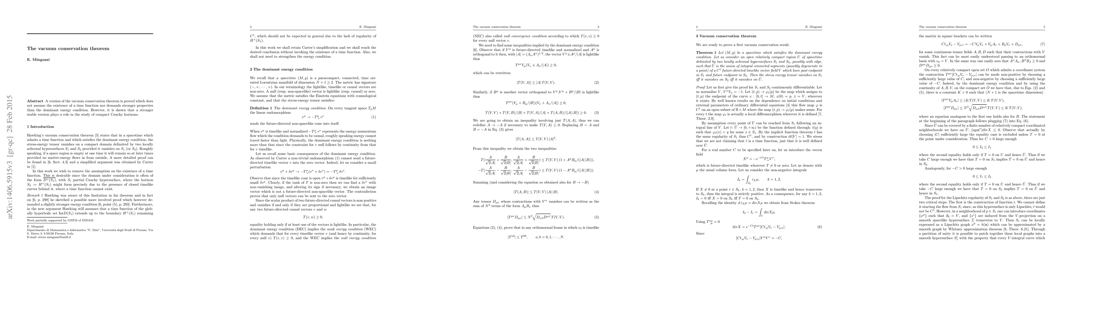 Summary: The paper proves a version of the vacuum conservation theorem without requiring a time function or stronger properties than the dominant energy condition, while also highlighting the significance of a stronger stable version in studying compact Cauchy horizons.