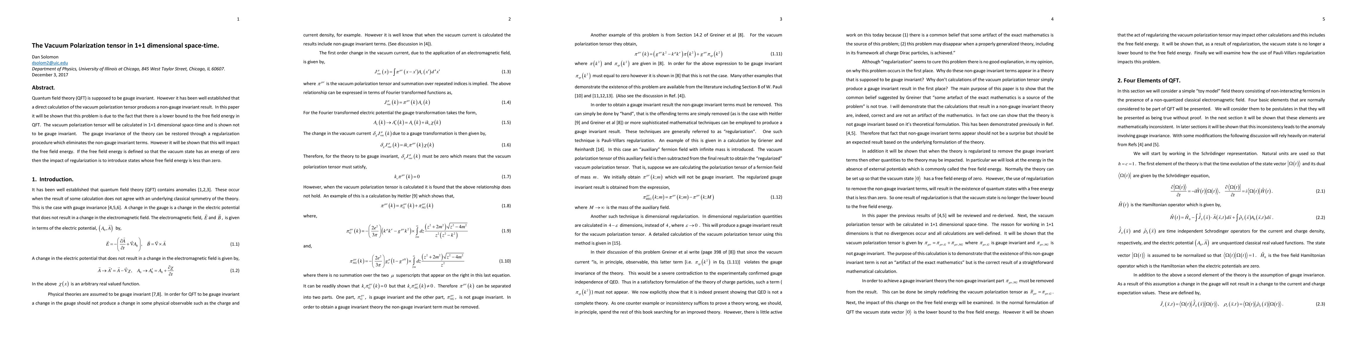 Quantum field theory (QFT) is supposed to be gauge invariant. However it has been well established that a direct calculation of the vacuum polarization tensor produces a non-gauge invariant result. In this paper it will be shown that this problem is due to the fact that there is a lower bound to the free field energy in QFT. The vacuum polarization tensor will be calculated in 1+1 dimensional space-time and is shown not to be gauge invariant. The gauge invariance of the theory can be restored through a regularization procedure which eliminates the non-gauge invariant terms. However it will be shown that this will impact the free field energy. If the free field energy is defined so that the vacuum state has an energy of zero then the impact of regularization is to introduce states whose free field energy is less than zero.