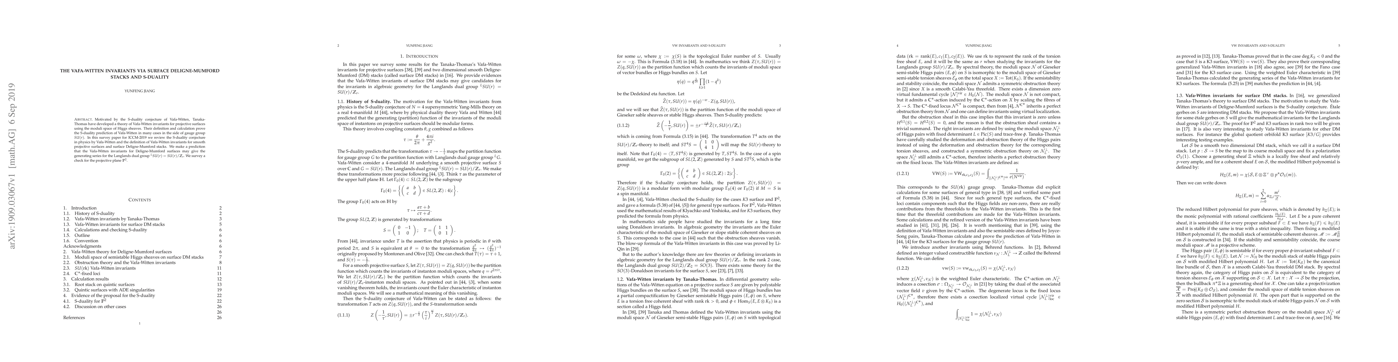 Motivated by the S-duality conjecture of Vafa-Witten, Tanaka-Thomas have developed a theory of Vafa-Witten invariants for projective surfaces using the moduli space of Higgs sheaves. Their definition and calculation prove the S-duality prediction of Vafa-Witten in many cases in the side of gauge group $SU(r)$. In this survey paper for ICCM-2019 we review the S-duality conjecture in physics by Vafa-Witten and the definition of Vafa-Witten invariants for smooth projective surfaces and surface Deligne-Mumford stacks. We make a prediction that the Vafa-Witten invariants for Deligne-Mumford surfaces may give the generating series for the Langlands dual group $^{L}SU(r)=SU(r)/\zz_r$. We survey a check for the projective plane $\pp^2$.