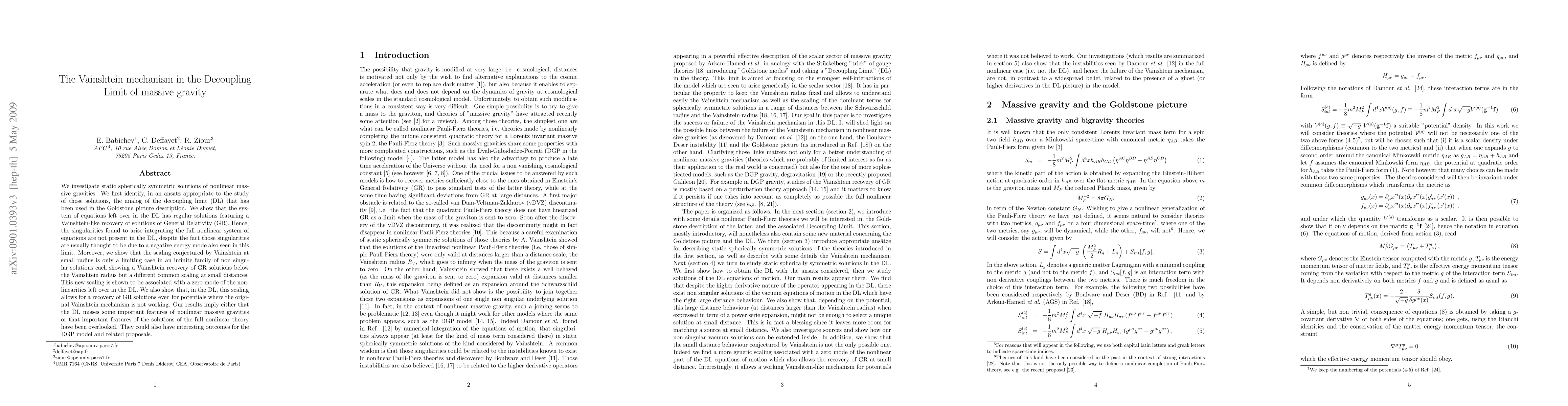 We investigate static spherically symmetric solutions of nonlinear massive gravities. We first identify, in an ansatz appropriate to the study of those solutions, the analog of the decoupling limit (DL) that has been used in the Goldstone picture description. We show that the system of equations left over in the DL has regular solutions featuring a Vainshtein-like recovery of solutions of General Relativity (GR). Hence, the singularities found to arise integrating the full nonlinear system of equations are not present in the DL, despite the fact those singularities are usually thought to be due to a negative energy mode also seen in this limit. Moreover, we show that the scaling conjectured by Vainshtein at small radius is only a limiting case in an infinite family of non singular solutions each showing a Vainshtein recovery of GR solutions below the Vainshtein radius but a different common scaling at small distances. This new scaling is shown to be associated with a zero mode of the nonlinearities left over in the DL. We also show that, in the DL, this scaling allows for a recovery of GR solutions even for potentials where the original Vainshtein mechanism is not working. Our results imply either that the DL misses some important features of nonlinear massive gravities or that important features of the solutions of the full nonlinear theory have been overlooked. They could also have interesting outcomes for the DGP model and related proposals.